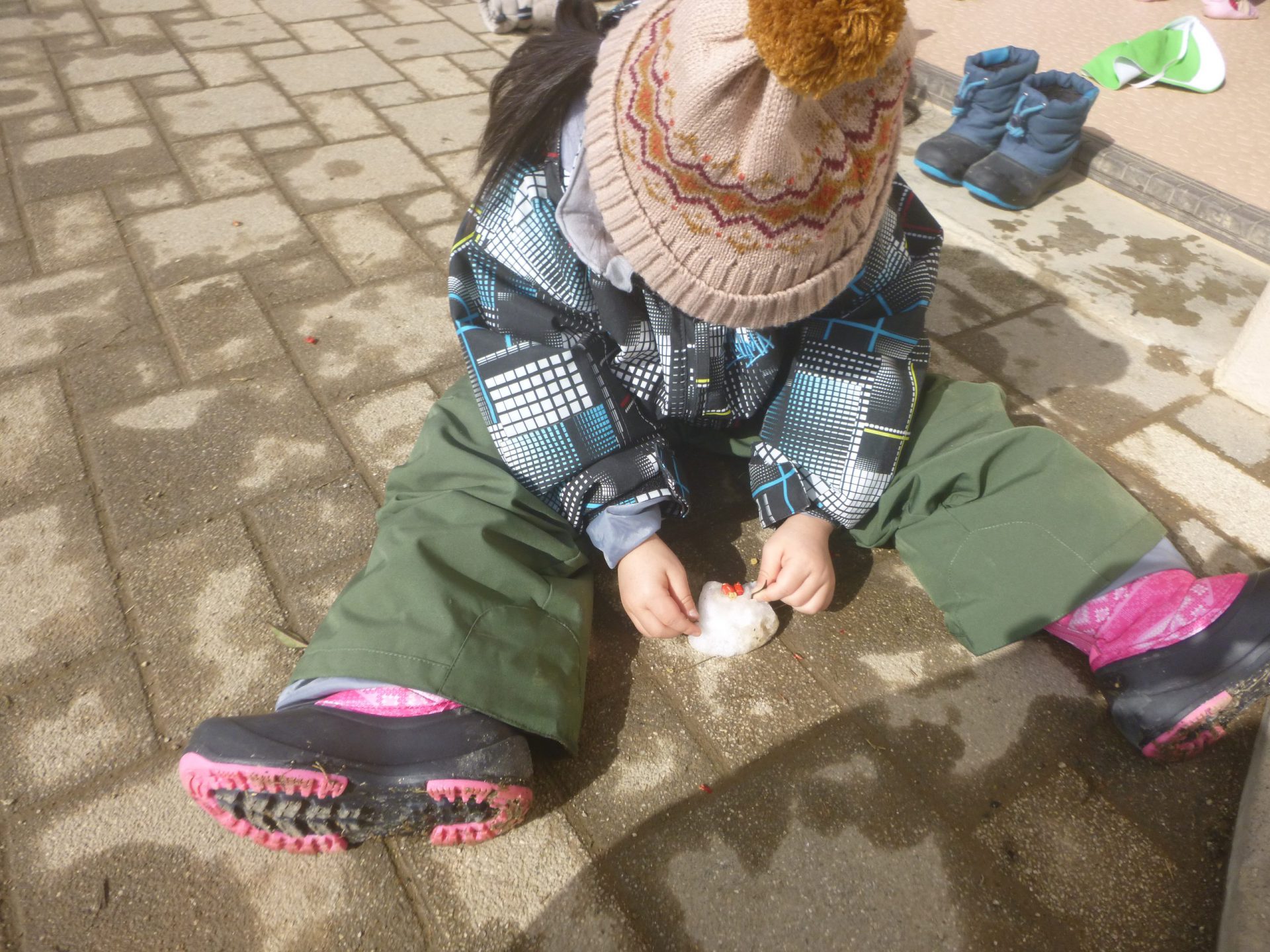 「見てみて!」さっそく雪を集めて遊び始めました。