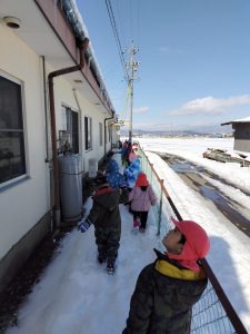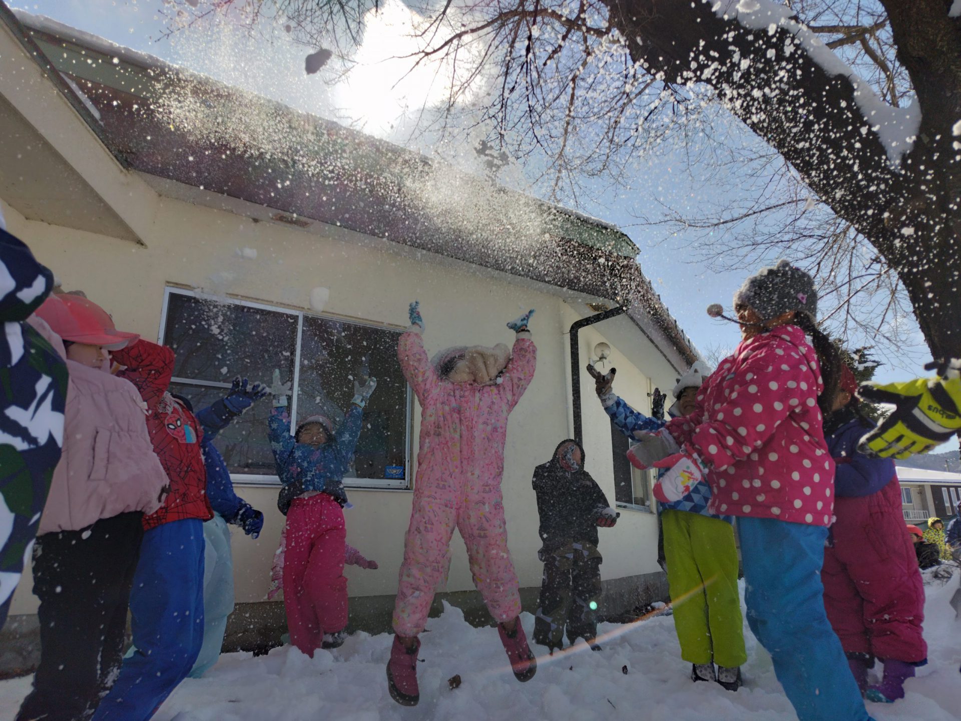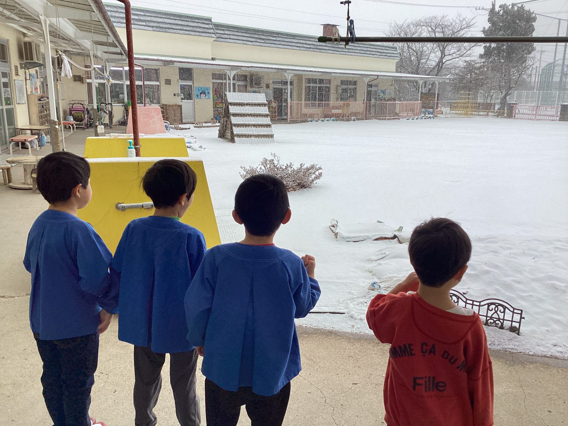 子どもたちにとっては待ちに待った雪!みんな嬉しそうに窓やテラスから雪を見ています。