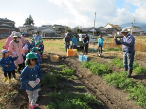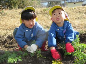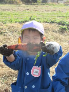 にんじんがどうやってできているのか実際に見たことのない子もいました。地域の方と一緒に収穫の喜びをわかちあい、会話を楽しみとても充実した時間になりました。今後も地域の方との交流を大切に、地域全体で子どもたちの成長を見守って行けるような関係づくりをしていきたいです。