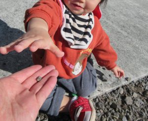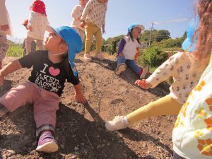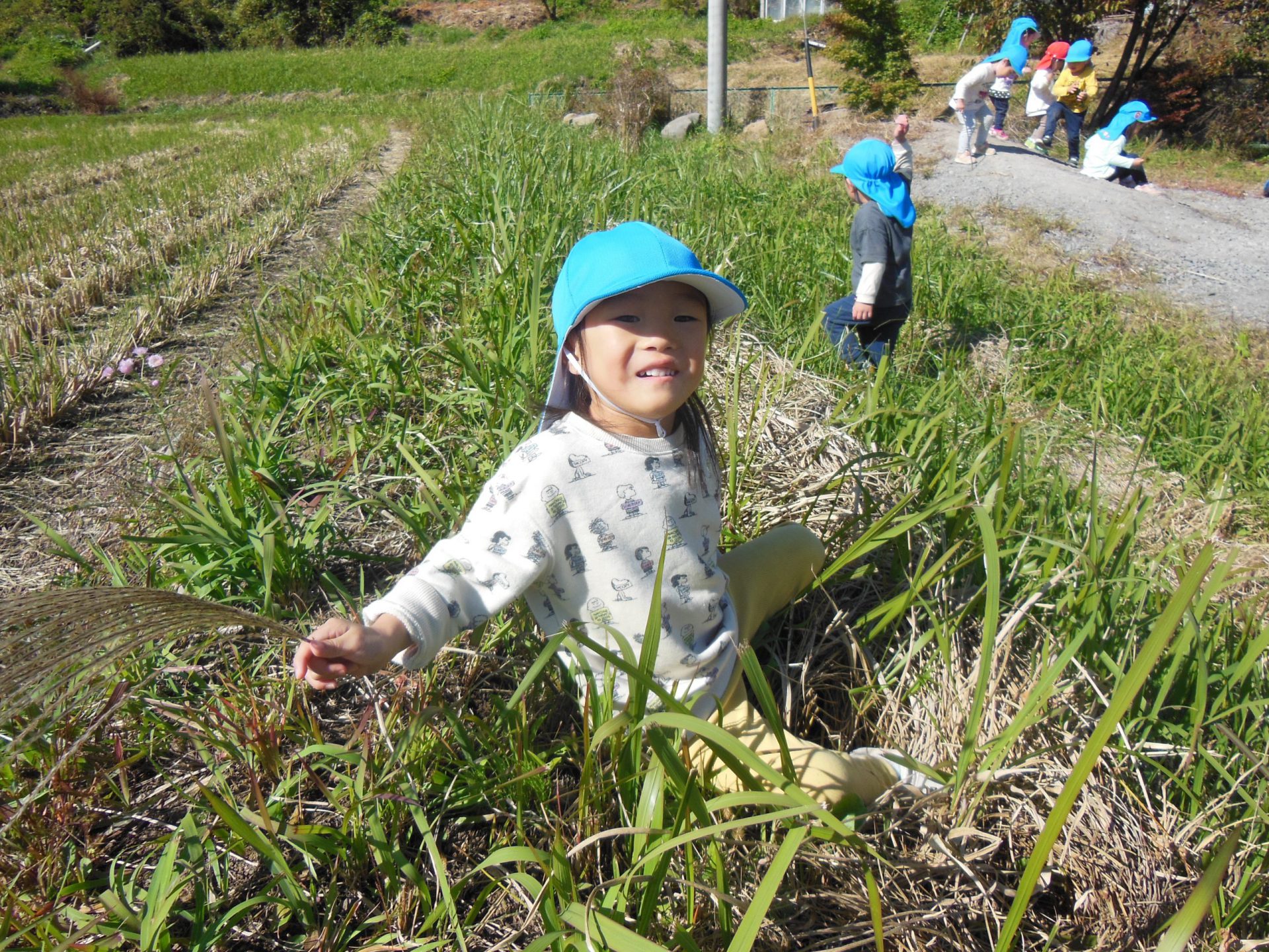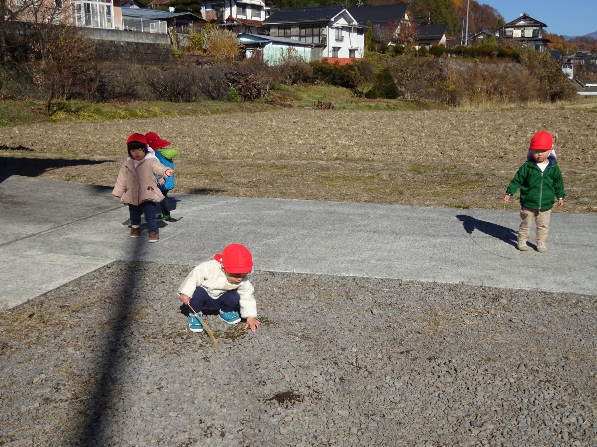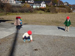 地面に生い茂る草も枯れ葉も石も、子ども達にとっては、とっても楽しい遊びの一つになりました。子ども達の『楽しい』を見つける力には、日々関心させられます。これからも、そんな子ども達の発見や気づきを大切にしていきたいなと思います。