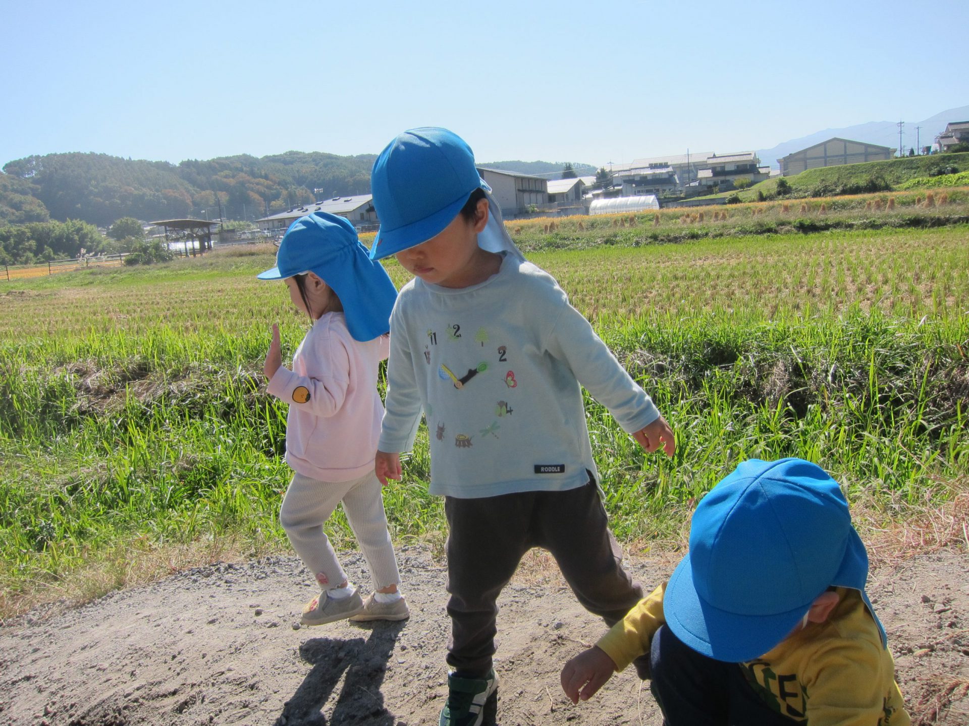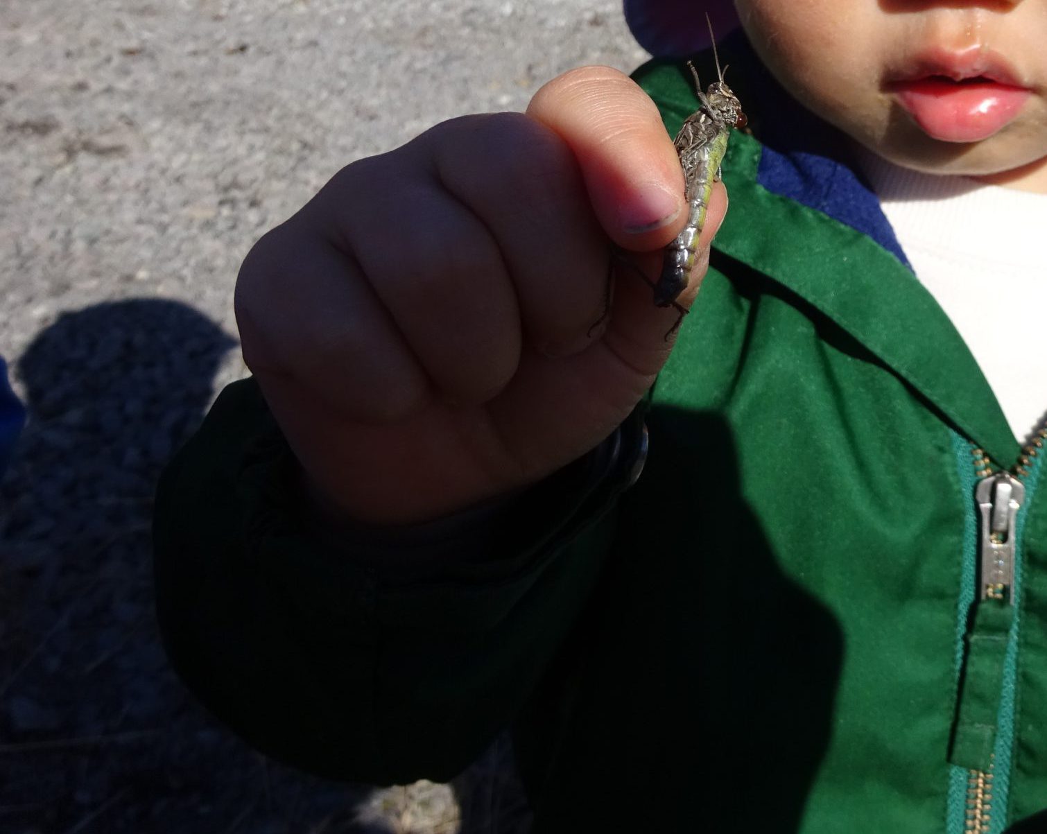園の近くの広場によくお散歩に行きます。園庭には入ってこないバッタなどにも触れられる貴重な場所です。追いかけたり捕まえてもらったりするうちにいつの間にか自分で捕れるようになっていました。小さな一歩の瞬間が垣間見えました。