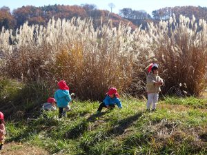 ススキの穂を箒に見立て、みんなでお掃除ごっこをして遊べました。