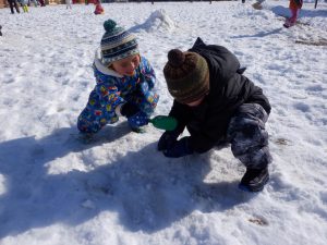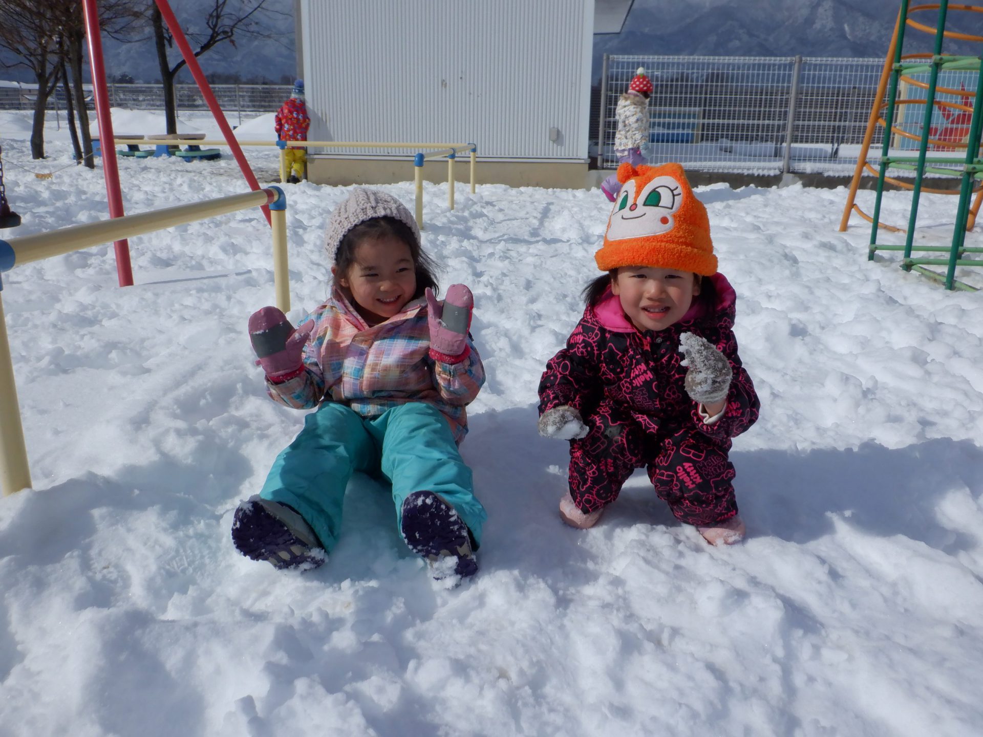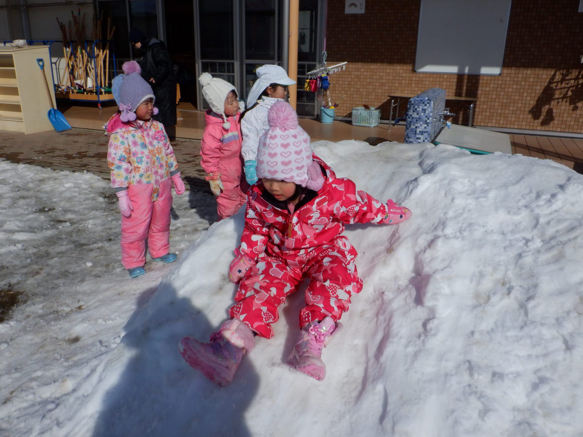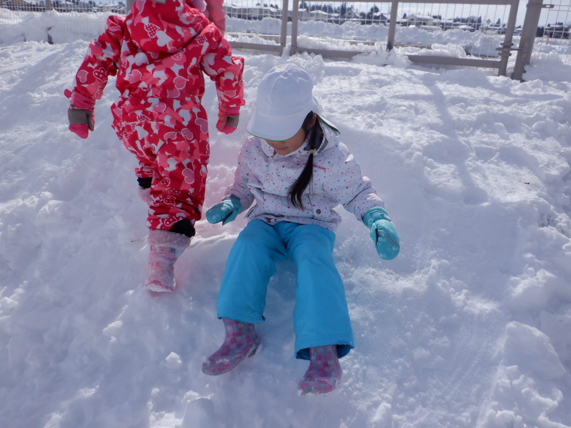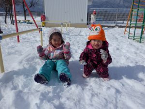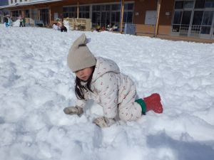 雪の冷たさを感じるだけでなく、雪でいっぱいの築山や土手を全身を使って登ったり、滑ったり楽しむことができました。