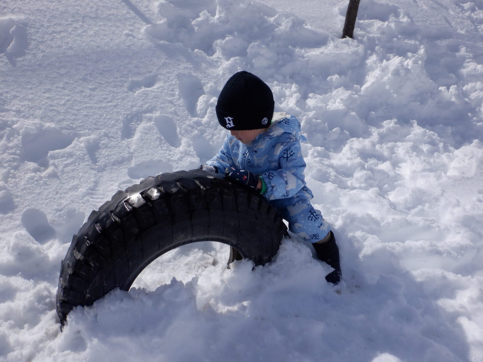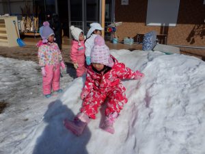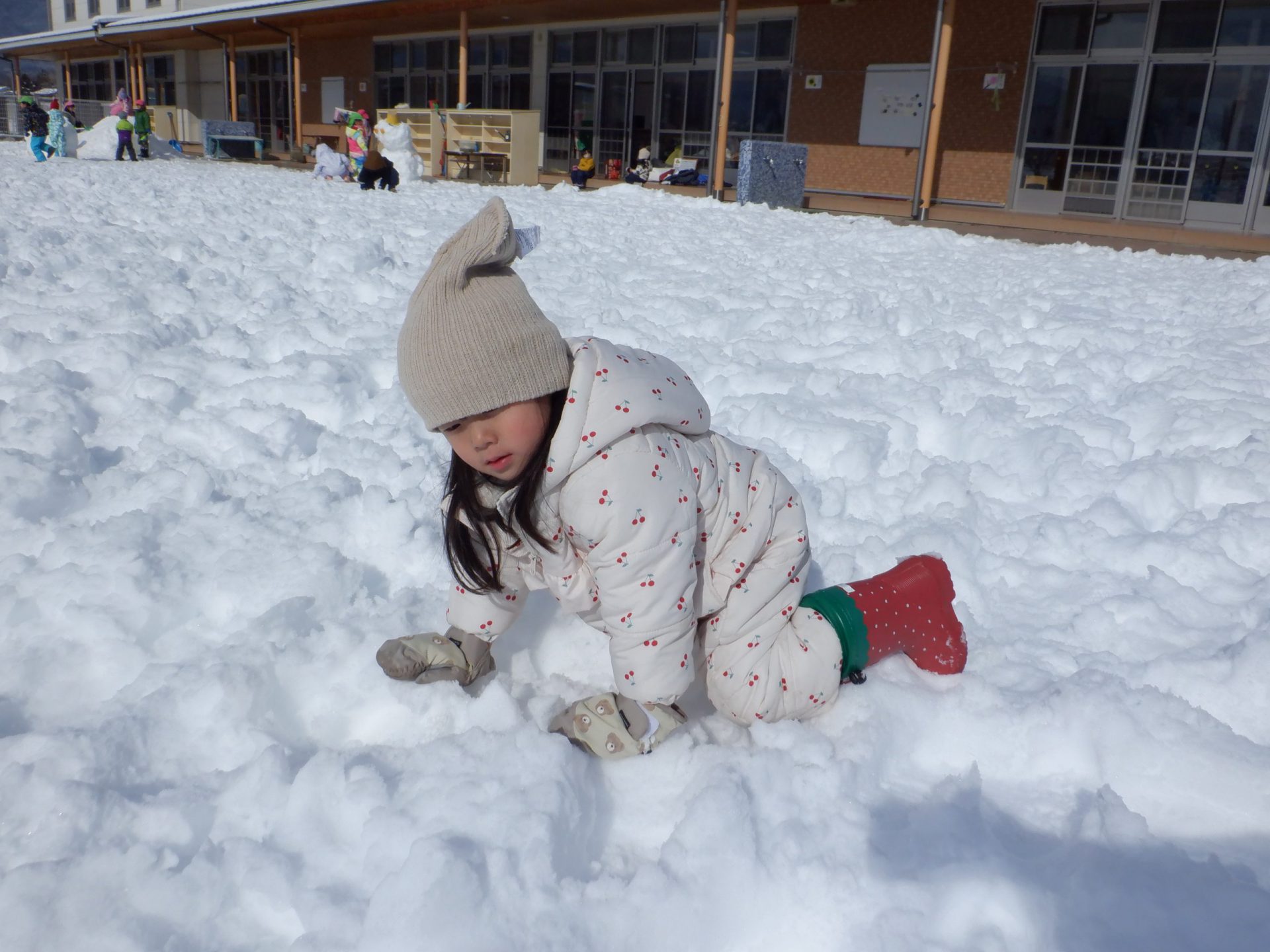 元気いっぱい戸外に飛び出していくと、「雪いっぱーい!」「つめたーい!」「そりするんだ!」と、それぞれやりたい遊びを見つけていく姿がありました。