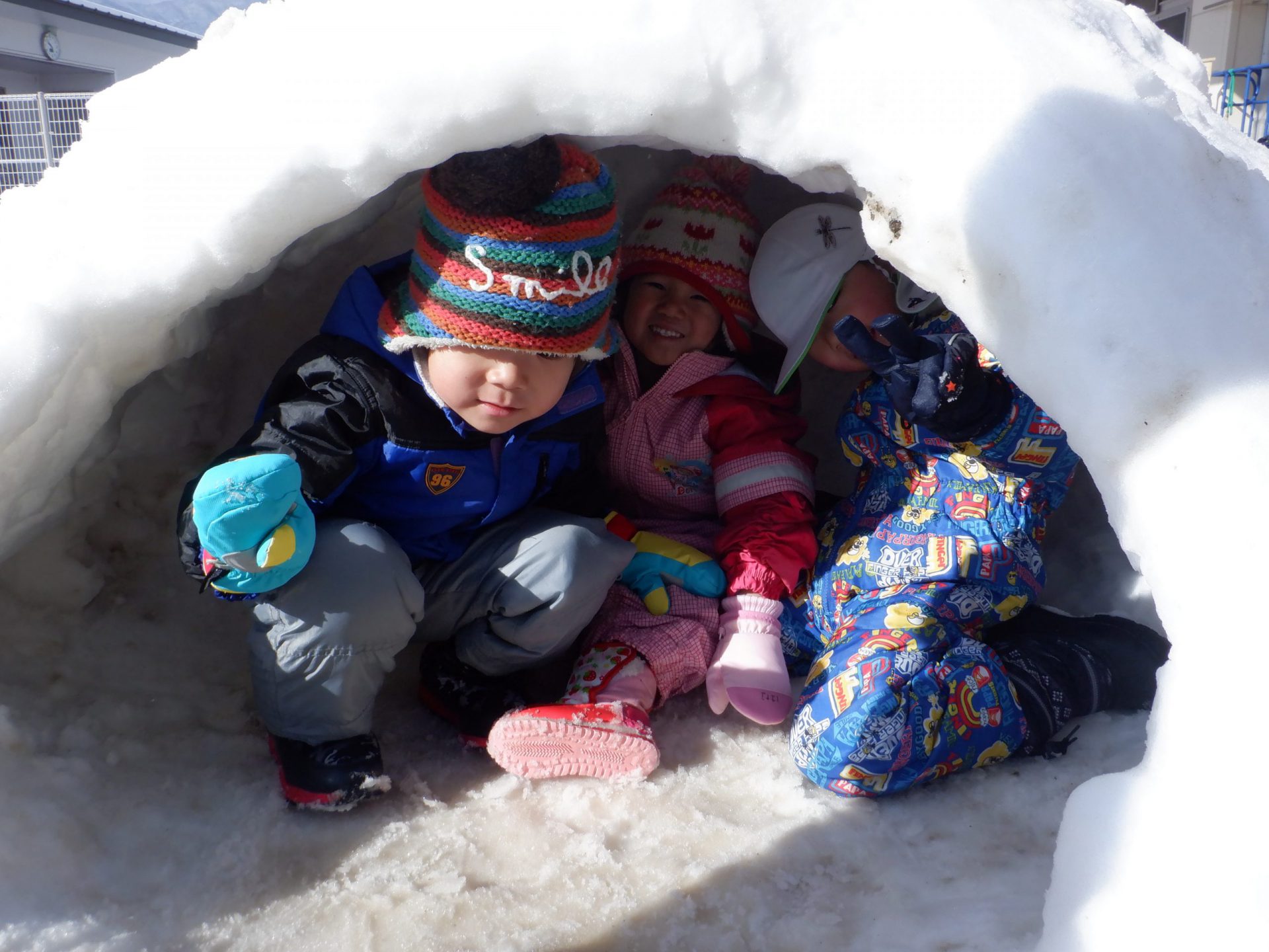 年長さんが作ったかまくらとすべり台にお邪魔して