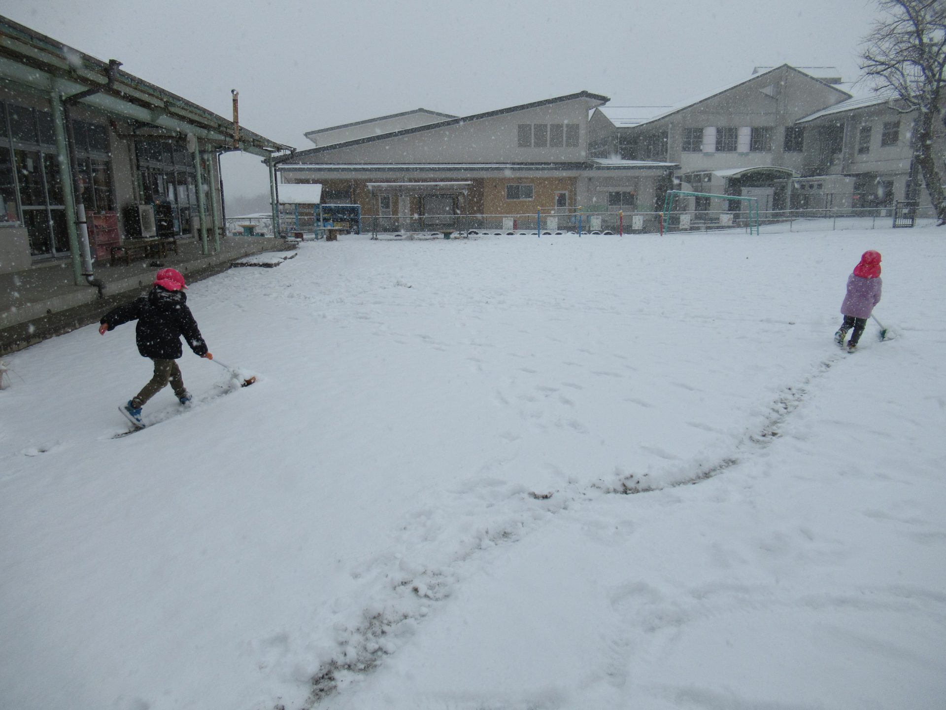 今年初めての雪が降りました。しんしんと雪が降り積もる様子を窓にへばりついて眺める子どもたち。