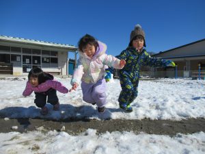 降り始めた雪の不思議さに子どもたちは寒さも忘れ目を輝かせ、手のひらに雪を受け止め「つめたい〜」と感動していました。降り積もる様子〜積もったあとの雪遊び。そして雪が溶けていく様子を五感を通して学び、冬の自然を体いっぱい楽しむことができました。