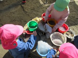 「残った雪を集めよう!氷もあったよ。」「雪パーティだね。」