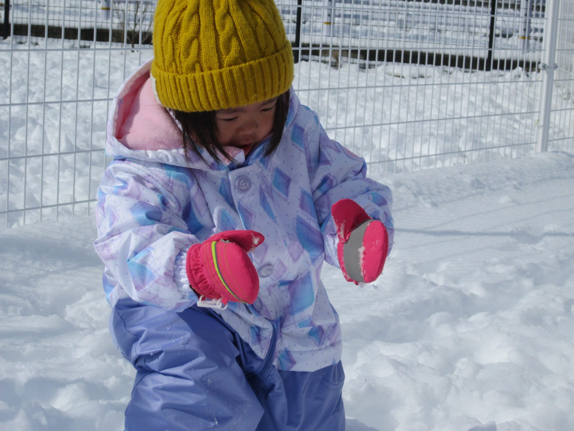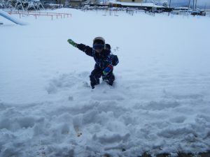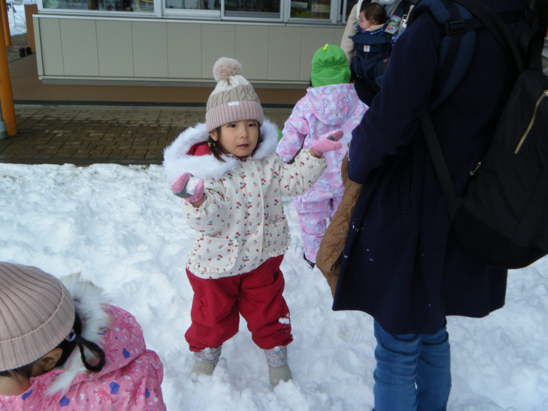 冷たい雪にちょっぴりびっくりしながらも、「ママ一緒に遊ぼうよー」