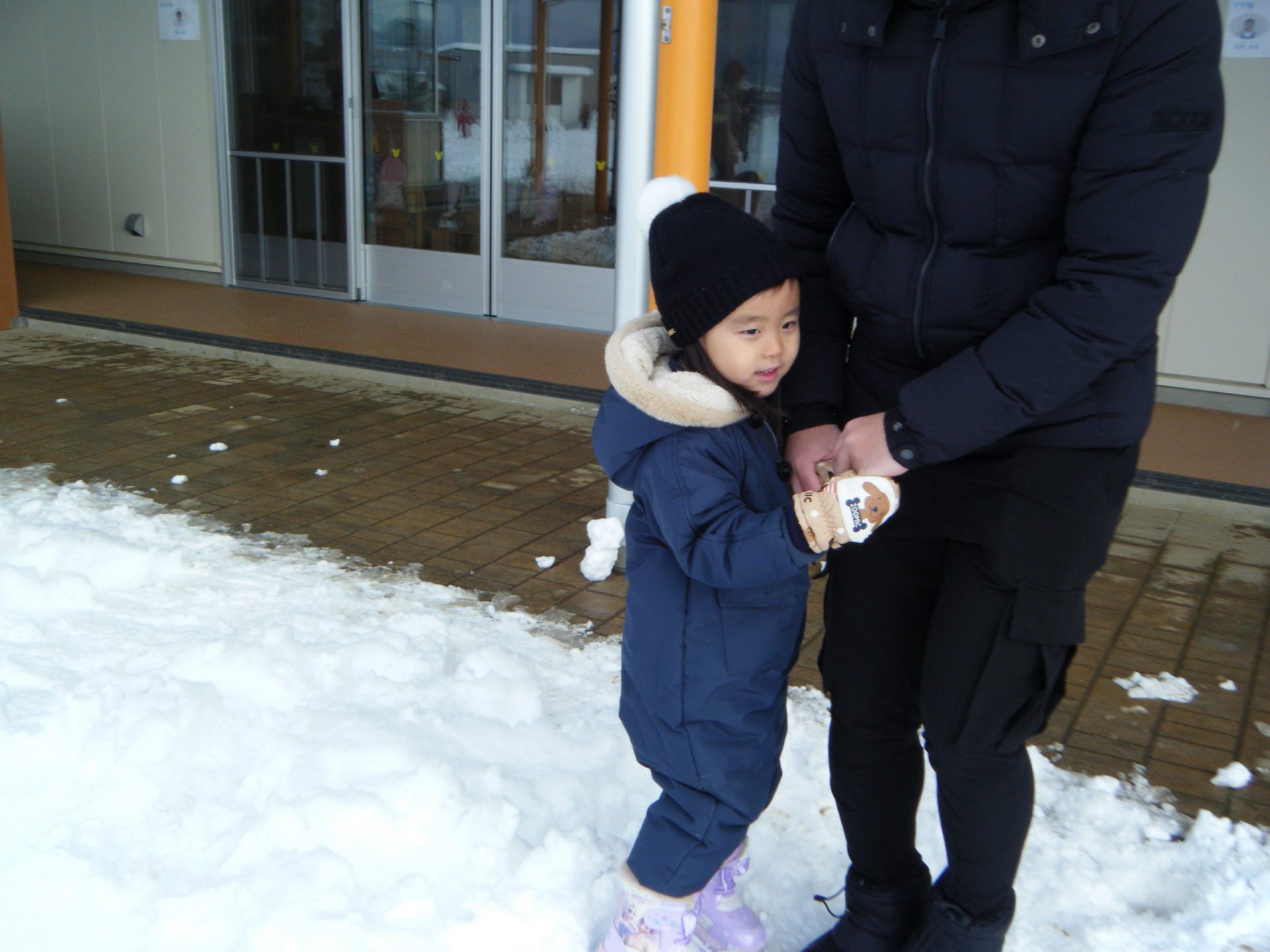 担任に手伝ってもらいながら、スキーウェアを着て、お庭に出てきました。