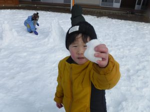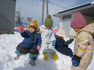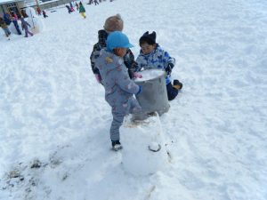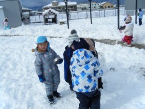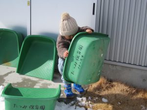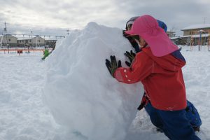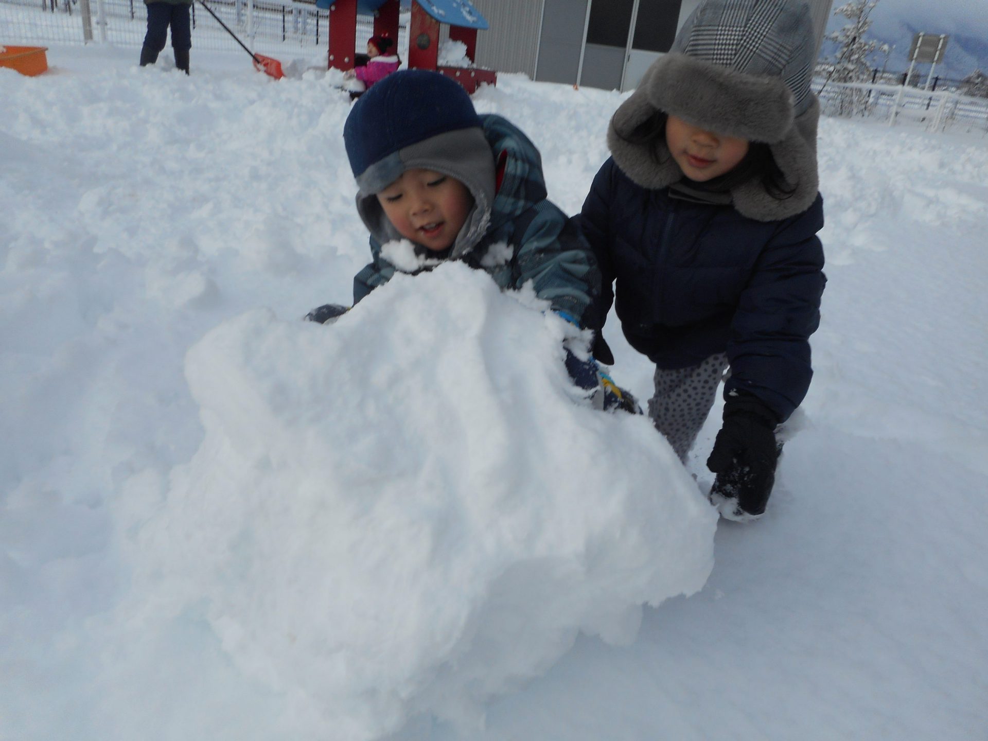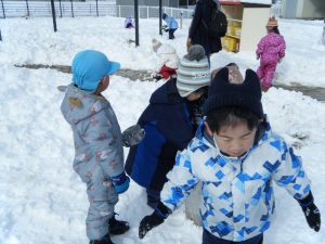 お友達と一緒に雪を集めています。「ここにいれてー!」