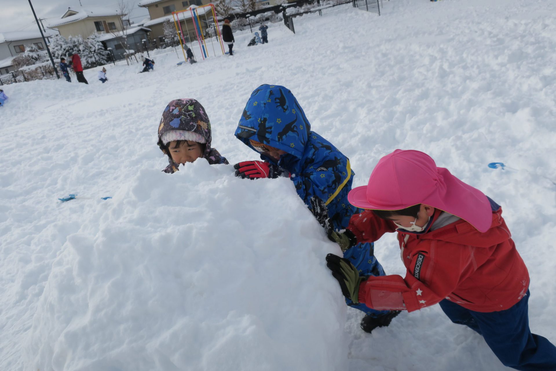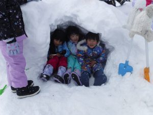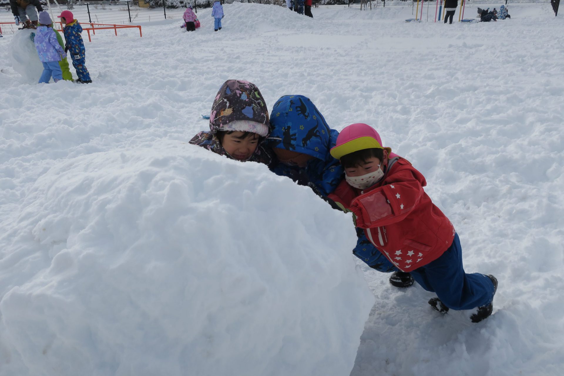 お見事!!かまくらができました!出来上がる頃には、小さい子から、年長さんまでみんなが集まっていました。