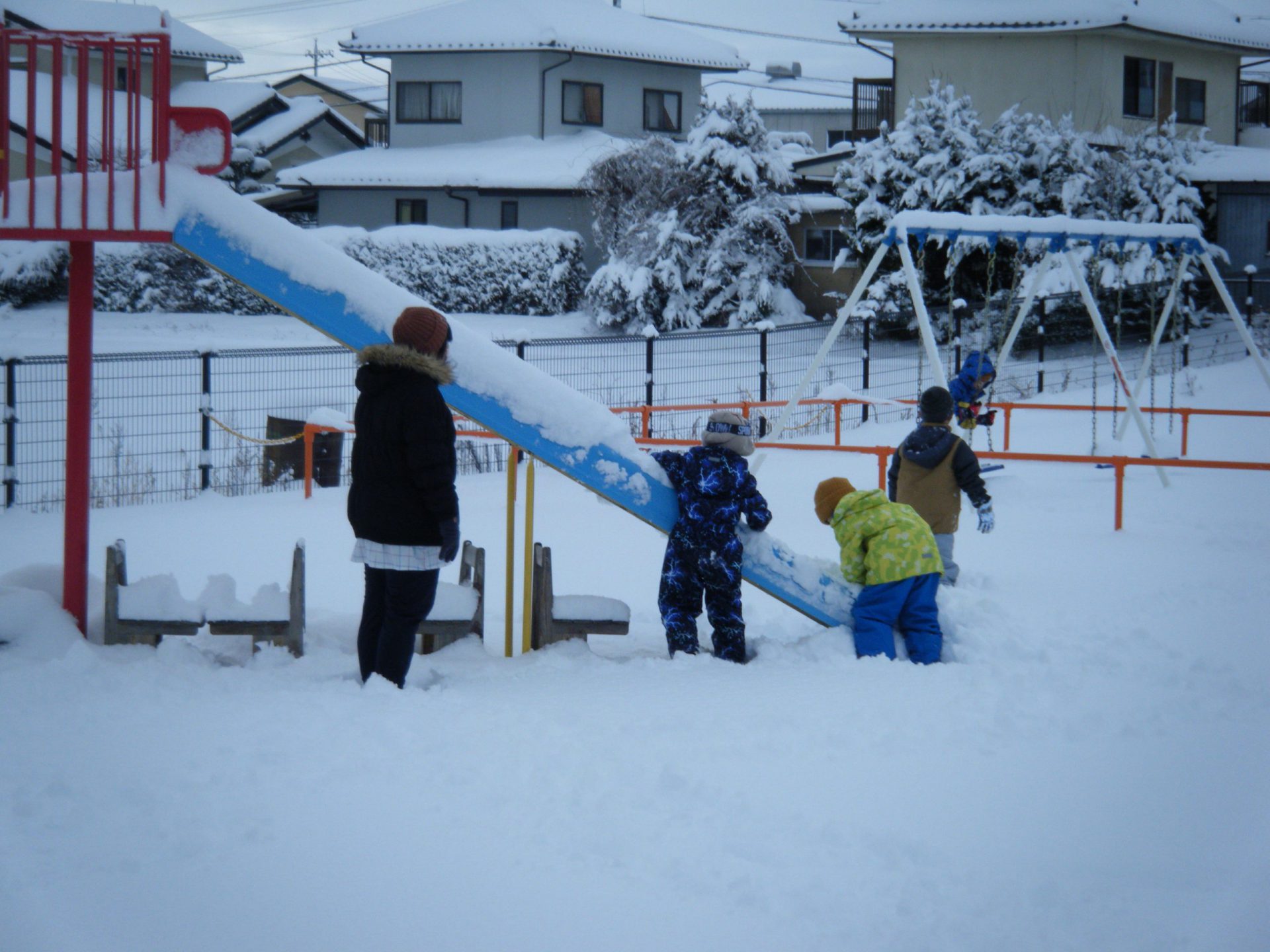 すべり台に積もった雪を、よけてもよけても・・・いっぱいあってなくならない!