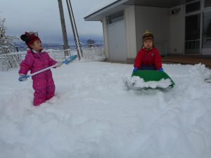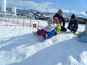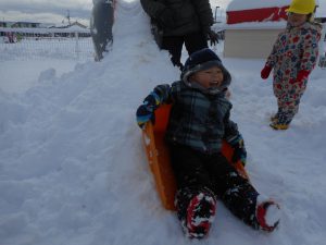 翌日は、少しだけ踏み固められた雪で、ソリ遊びをします。