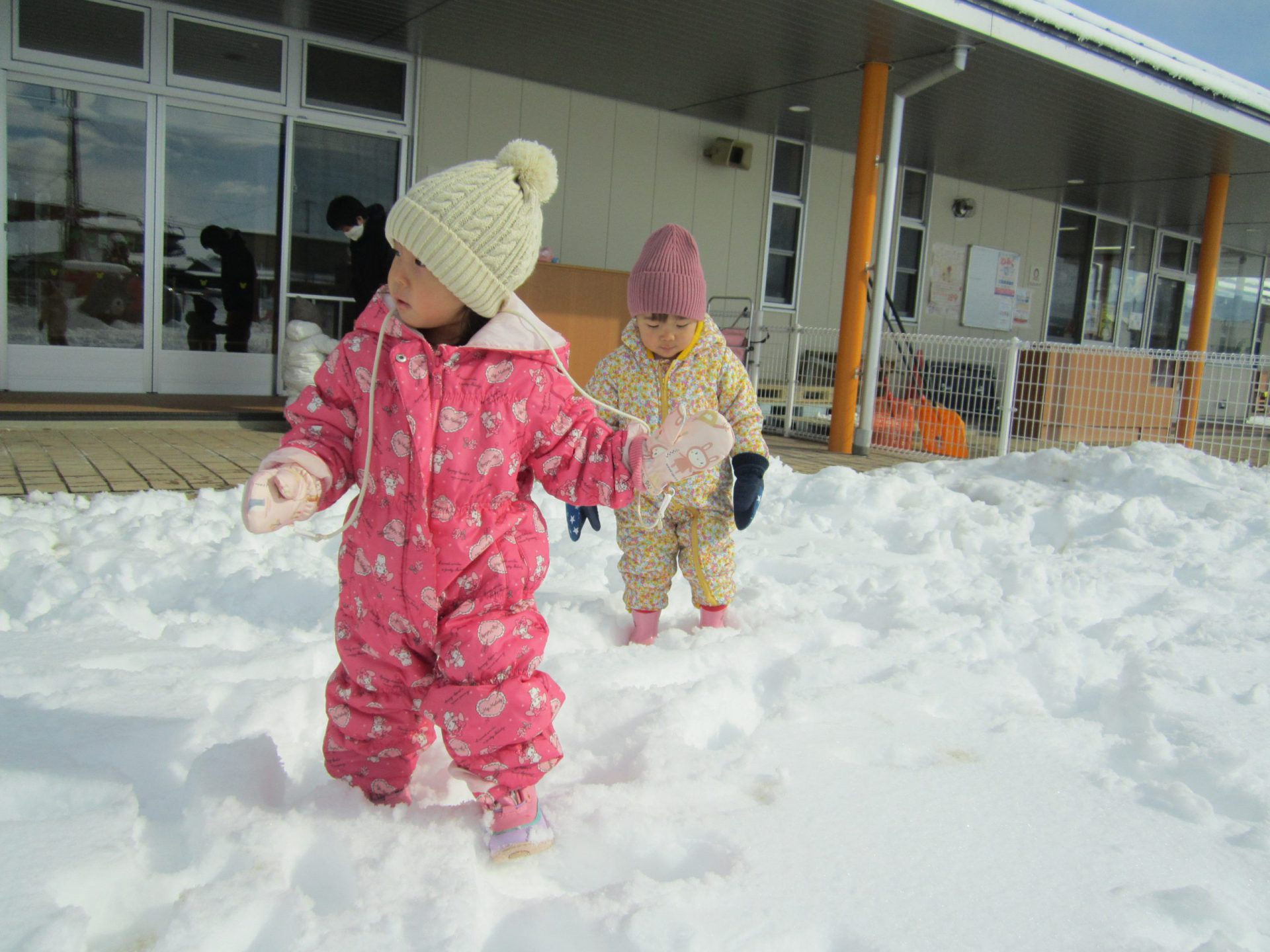 登園してきた子どもたちは、早く雪で遊びたくて、自宅からスノーウェアを着てきた子もいます。