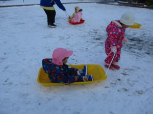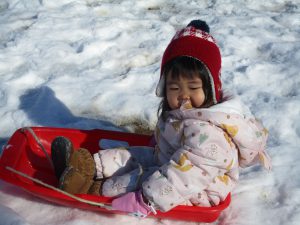 1歳児は思いのままに雪に触れています。そりは引っ張らないと動かないことに気がついたようで「よいしょ、よいしょ」とかけ声 をかけるのですが、なかなか動きません。