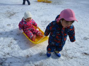 そして、「じゅんばんこ」と言って交代してそり遊びを楽しんでいる2人でした。