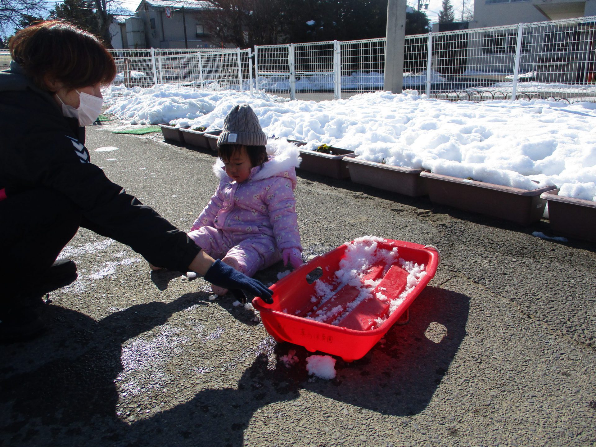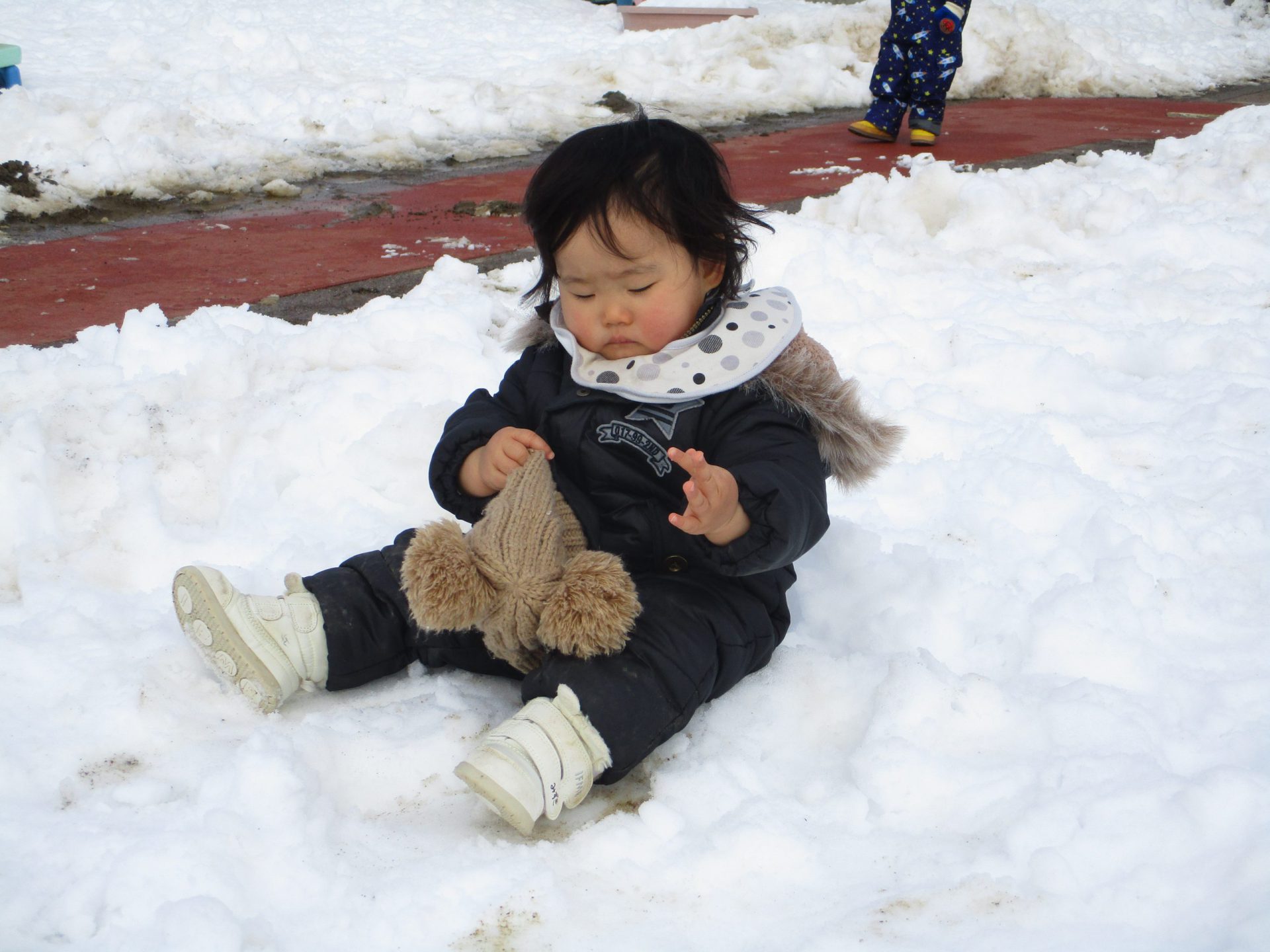 0歳児は生まれて初めての雪遊び。あまりの歩きづらさで戸惑いもありましたが、雪を触ったり、踏みつぶして探索をしていました。