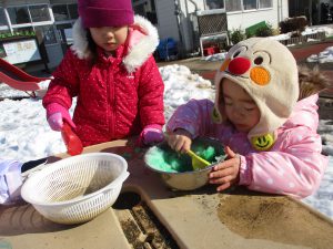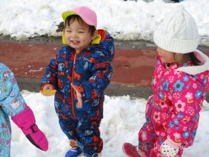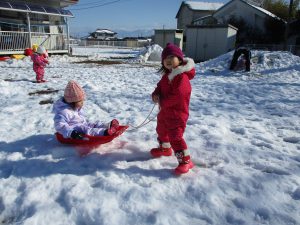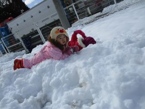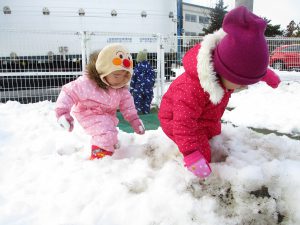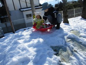 ・寒くて縮こまっていた子も雪遊びを通して、体全体を使い遊んだことで楽しさを味わい、戸外遊びを楽しめるようになりました。