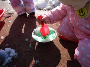・「雪に色をつけちゃおうか」と絵の具を溶かしたペットボトルを差し出してみました。