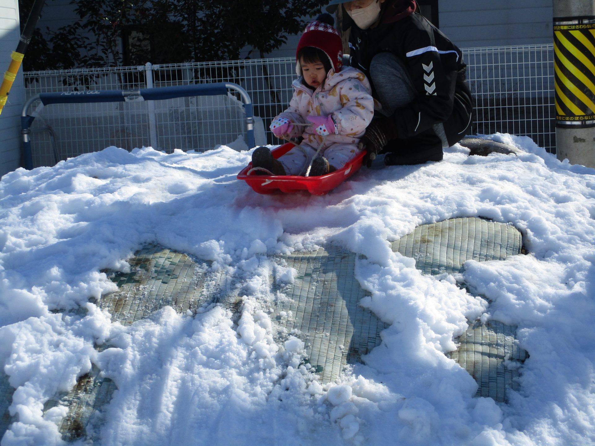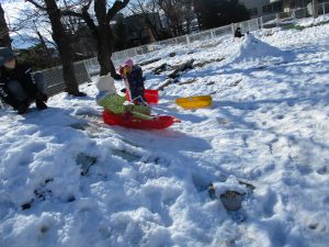 なんと築山からそり滑りが始まりました。「大丈夫かしら」と心配したのですが・・・