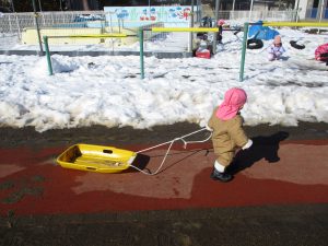 0歳児は雪の上をうまく歩けず、まずは雪のないところでそりを引っ張る練習から始めたようです。
