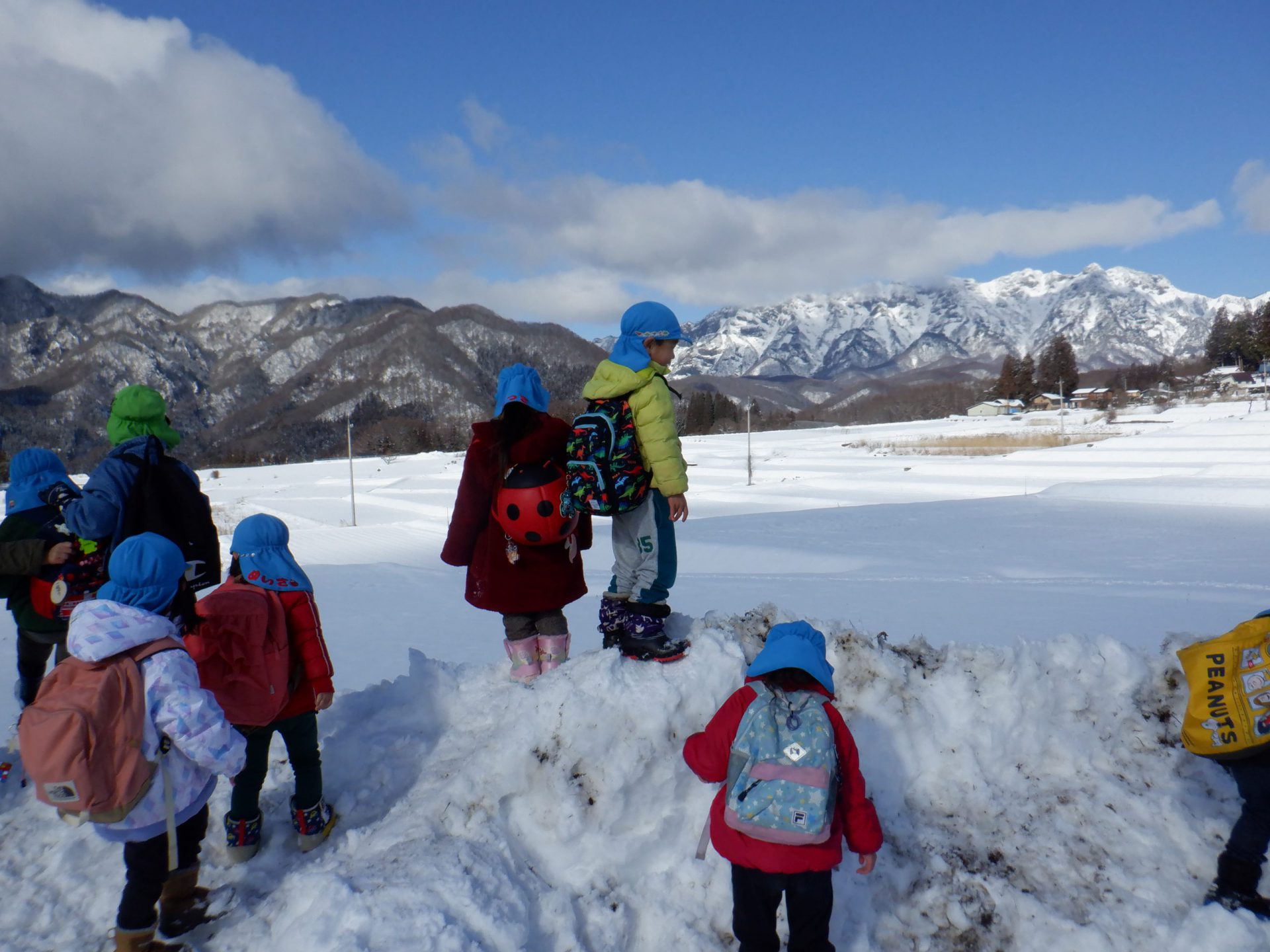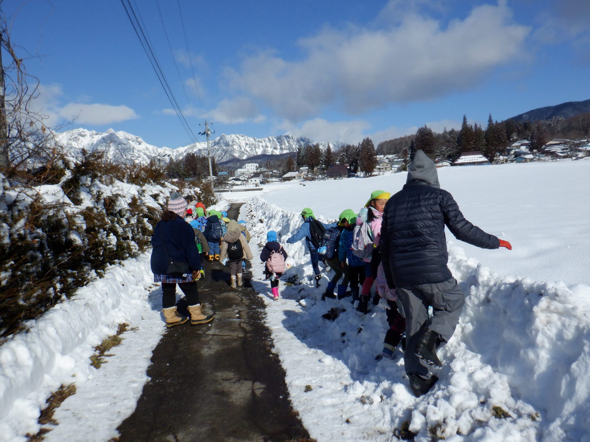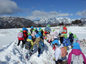 2月のとある日、年長児と年中児でお散歩に出掛けてきました。風が冷たく空気が澄んだ戸隠地域。道の雪は溶け春先のような散歩道。見つけたものを友達と共有したり、年長児は年中児に対して発見や気づきを教えてくれる姿がありました。