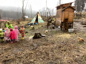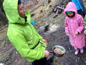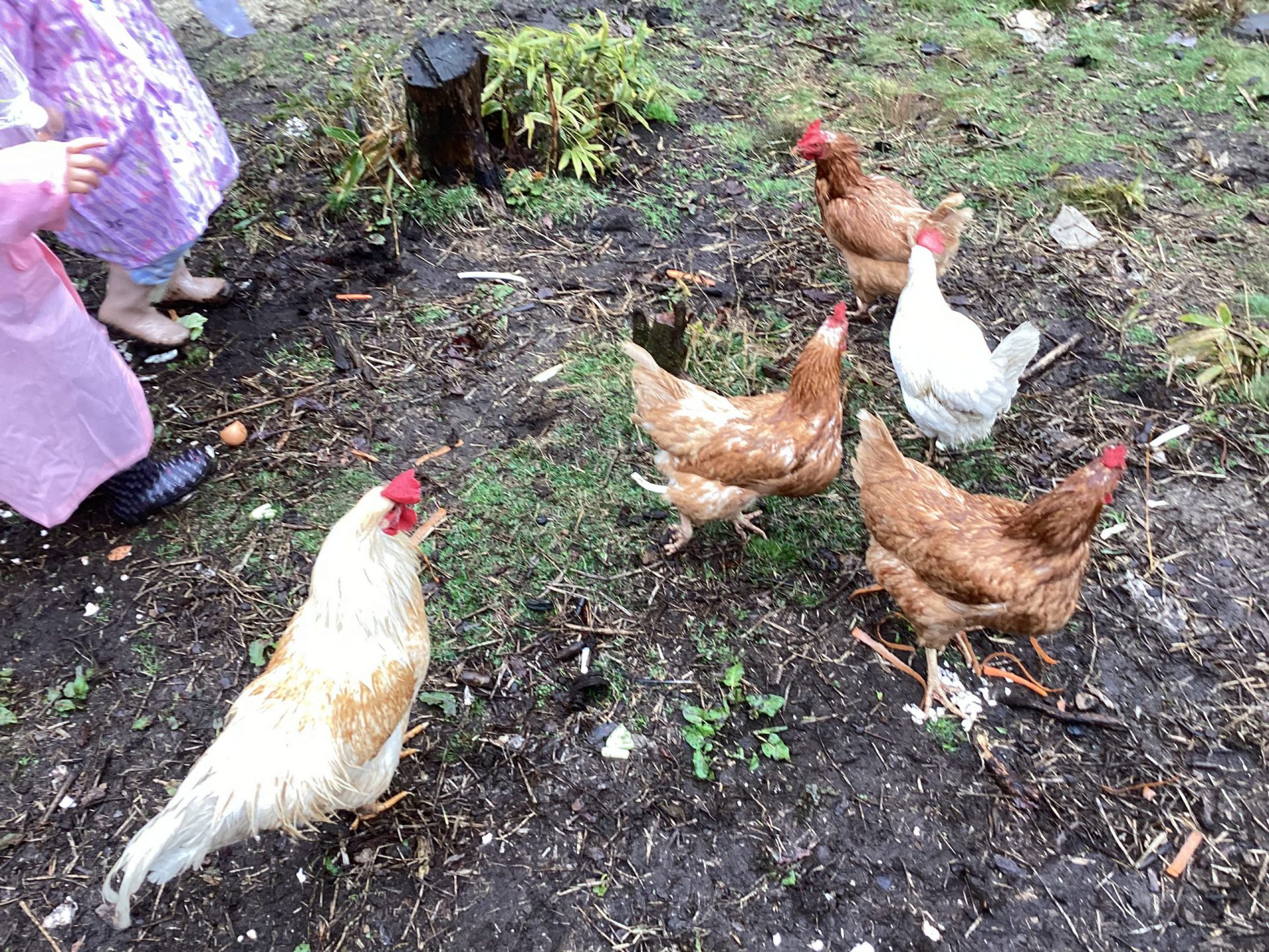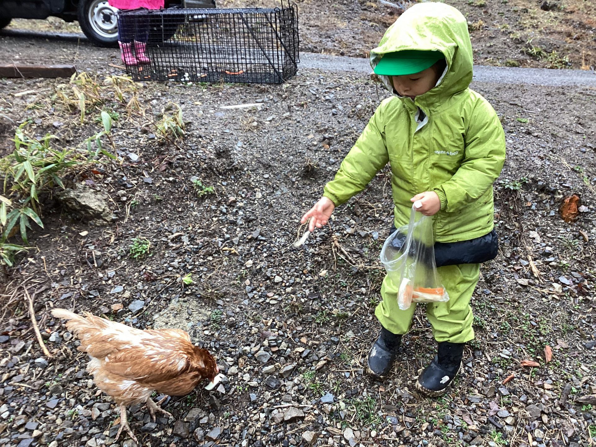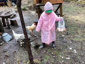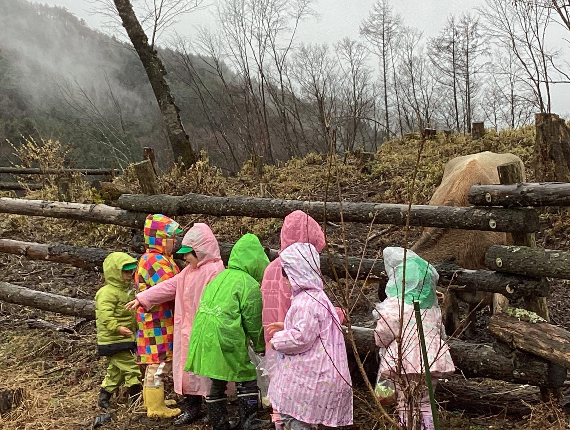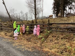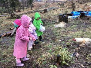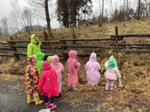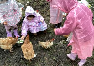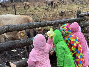 ・この日はあいにくの雨降りでしたが、子どもたちは雨を気にすることなく、触れ合いや餌やりをしっかり楽しんでいました。出かける事を保育士から聞いた日から、子どもたちは、餌として良いものと、不向きな物をしっかり覚えて、お家の人に話して集めていました。その餌を持って、鶏や牛にあげる事を楽しみにしていた為、雨降りや手の汚れも気にせず、夢中になって楽しめたのかなと思います。