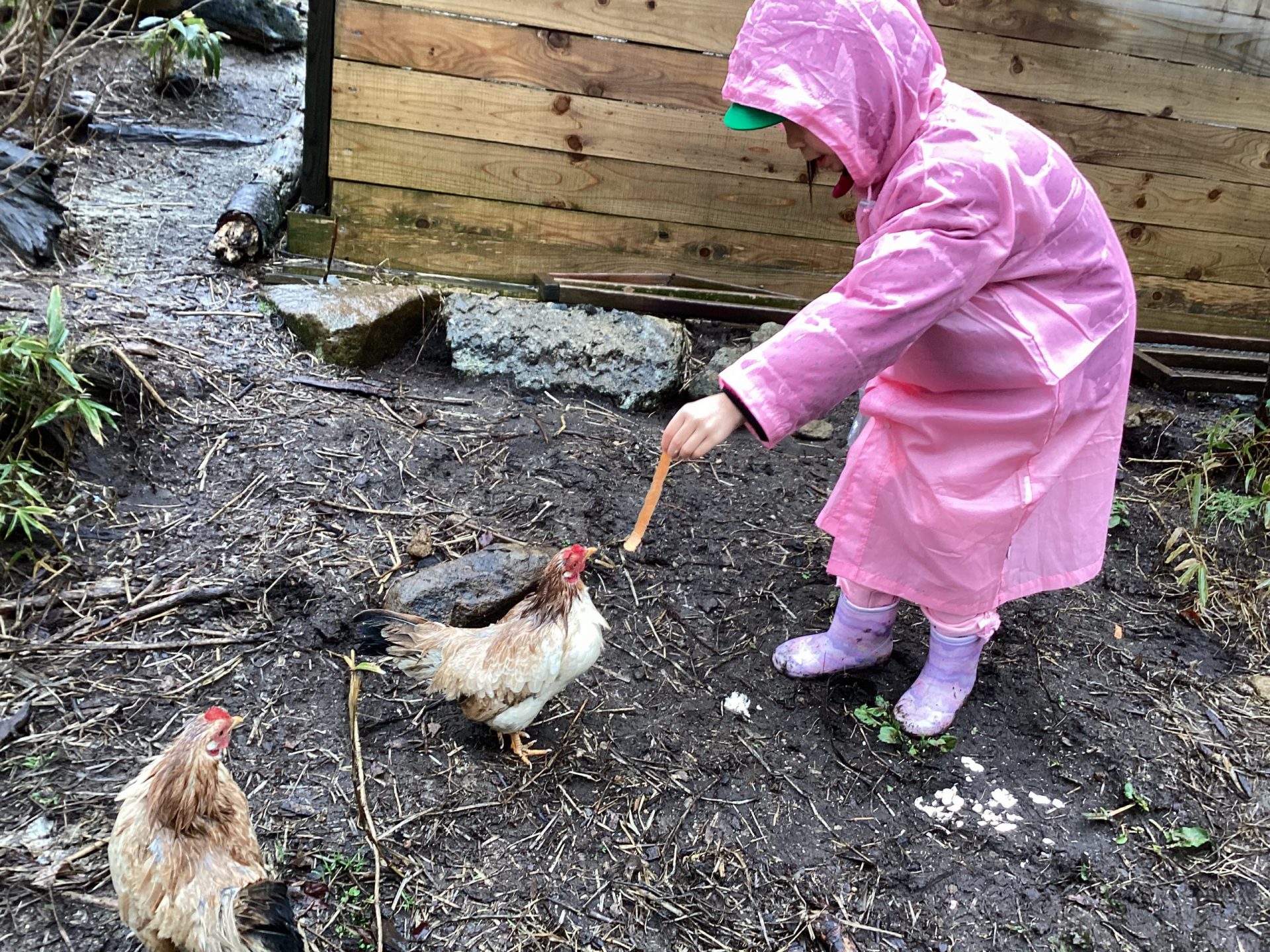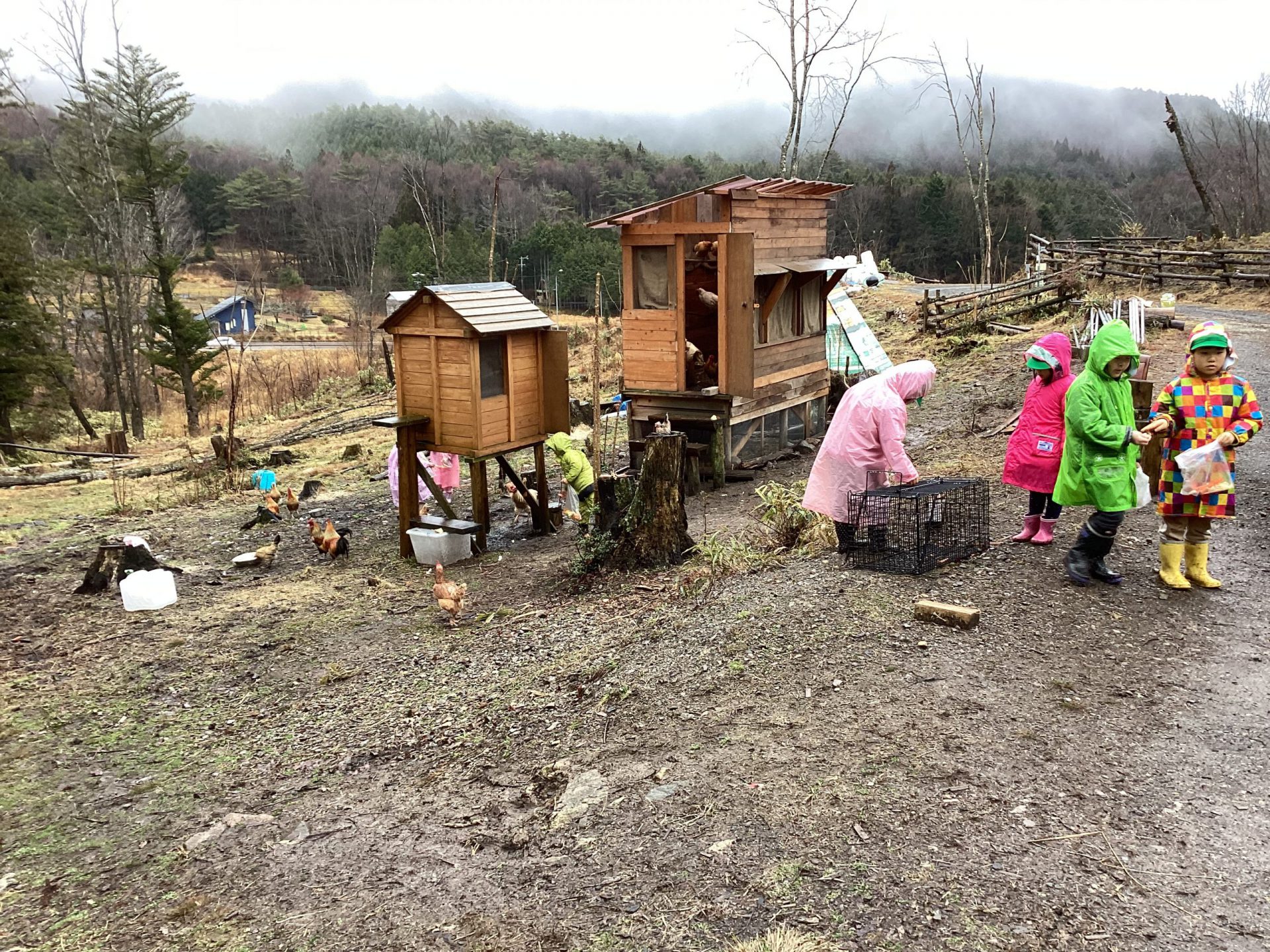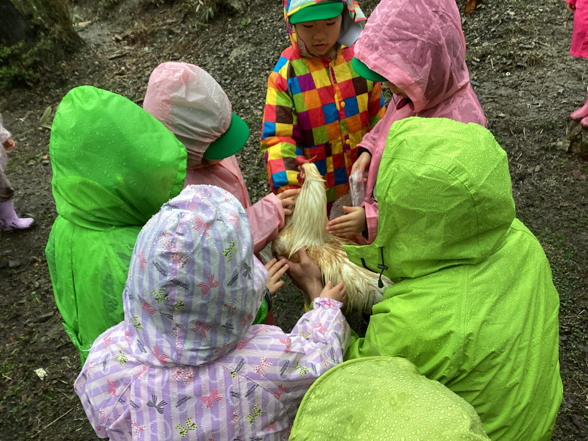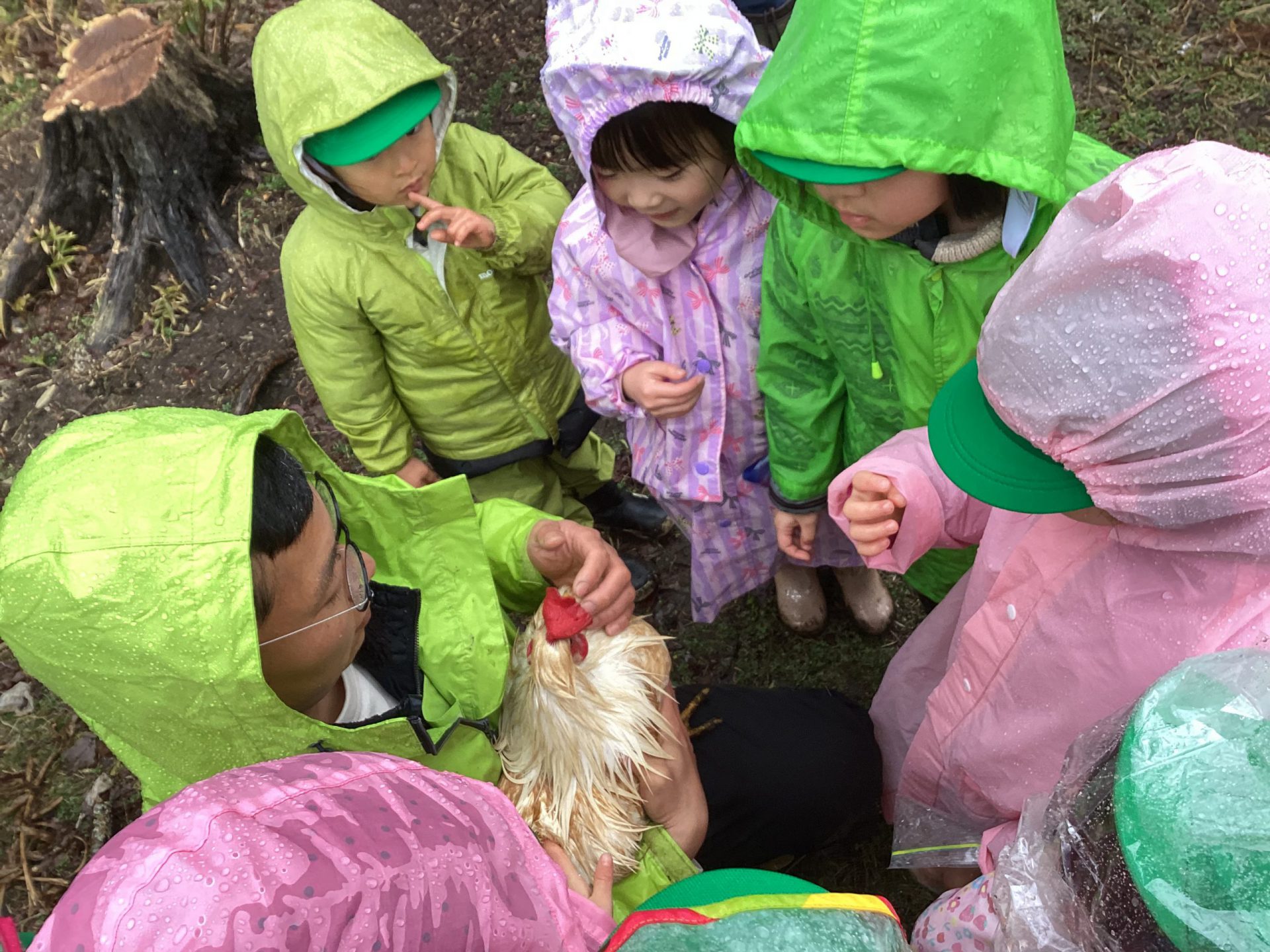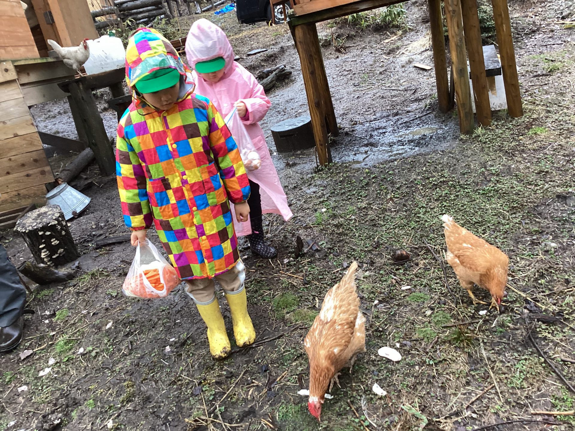 この日はあいにくの雨降りとなってしましましたが、子どもたちは鶏や牛と触れ合う事を楽しみにしていました。