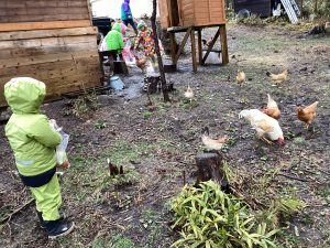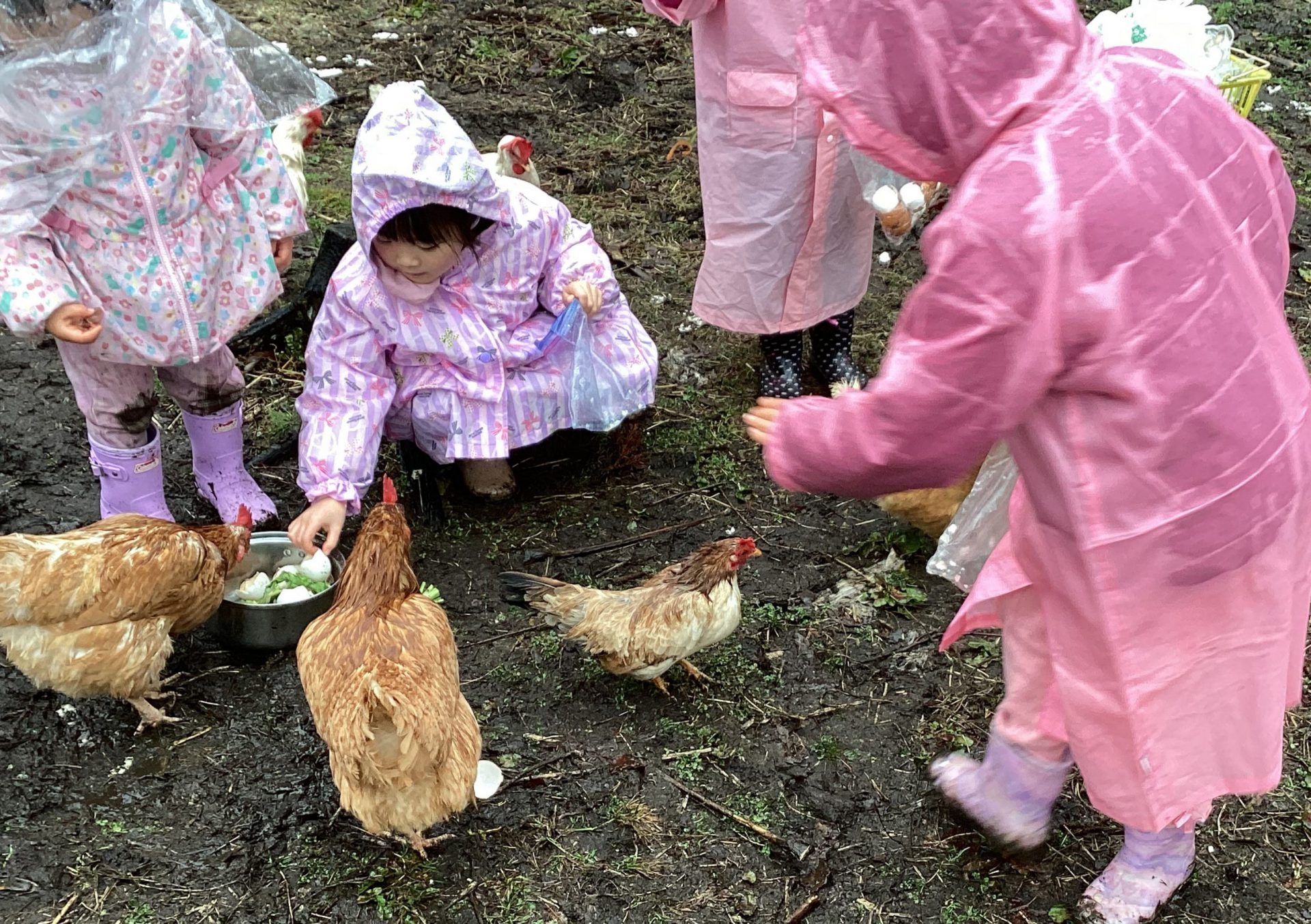 鶏の体について学んだ子どもたちは、再び餌やりを楽しみます。
