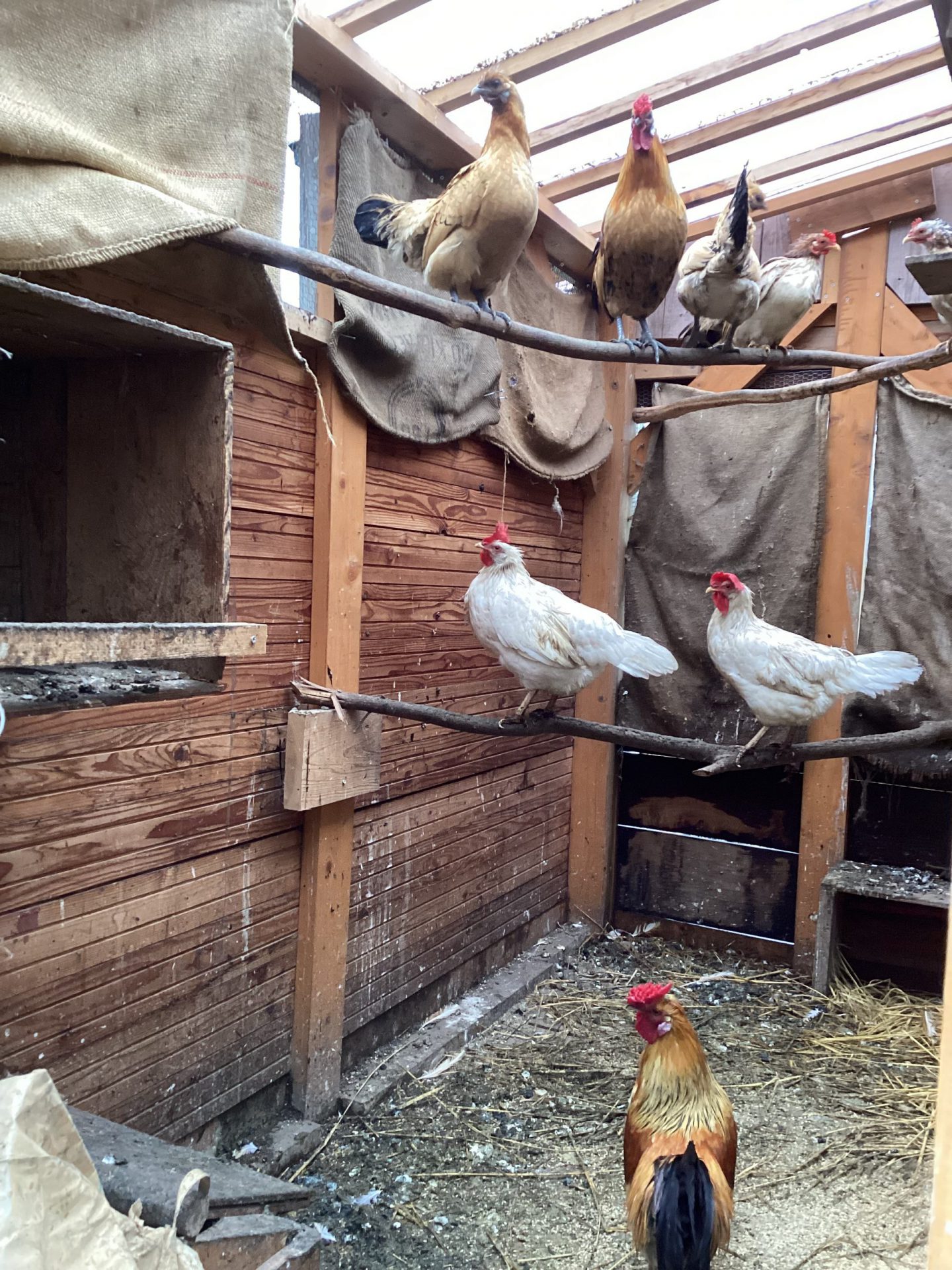 おなかがふくれた鶏たちは、小屋に戻って一休み。