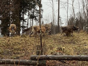 しばらくすると「モゥー」と鳴きながら、山の上の奥から牛たちが降りてきました。全部で8頭。その中には、2月の初めに生まれたばかり(当時、生後20日ほど)の赤ちゃん牛も一緒です。