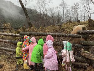 今度は、牛との触れ合いです。みんなで「コウコウ」と大きな声を山に向かって呼びます。牛に聞こえるように、何度も何度も呼びます。