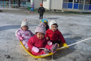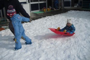 繰り返してソリ遊びをしていると、コツをつかんでバランスを取って乗れるようになりました。スピードを出しても落ちないようになってソリに乗るのが上手になり、園庭一周しても「もっかいもっかい!」保育士の方がヘトヘトです、、。