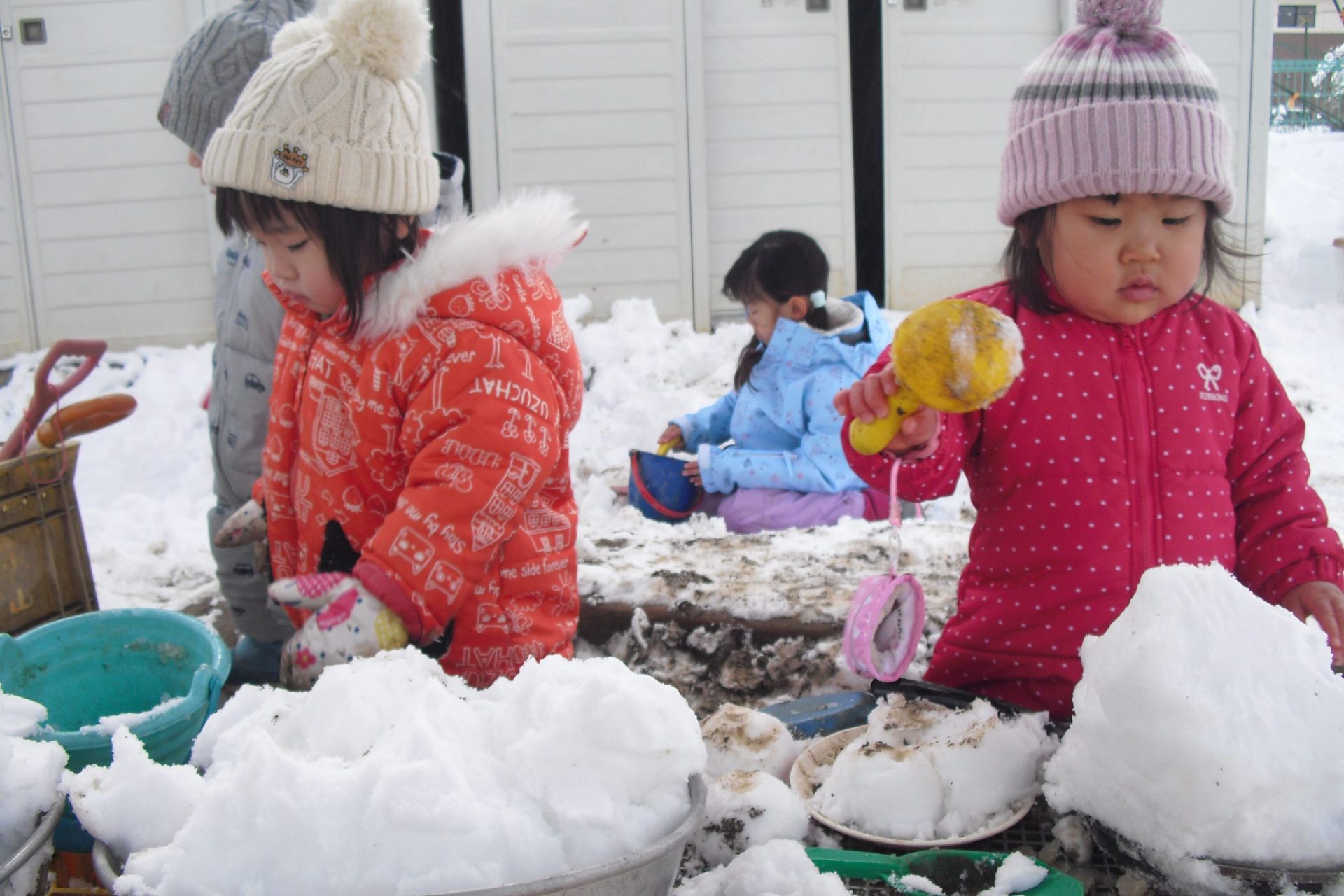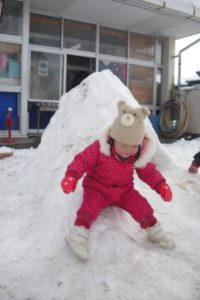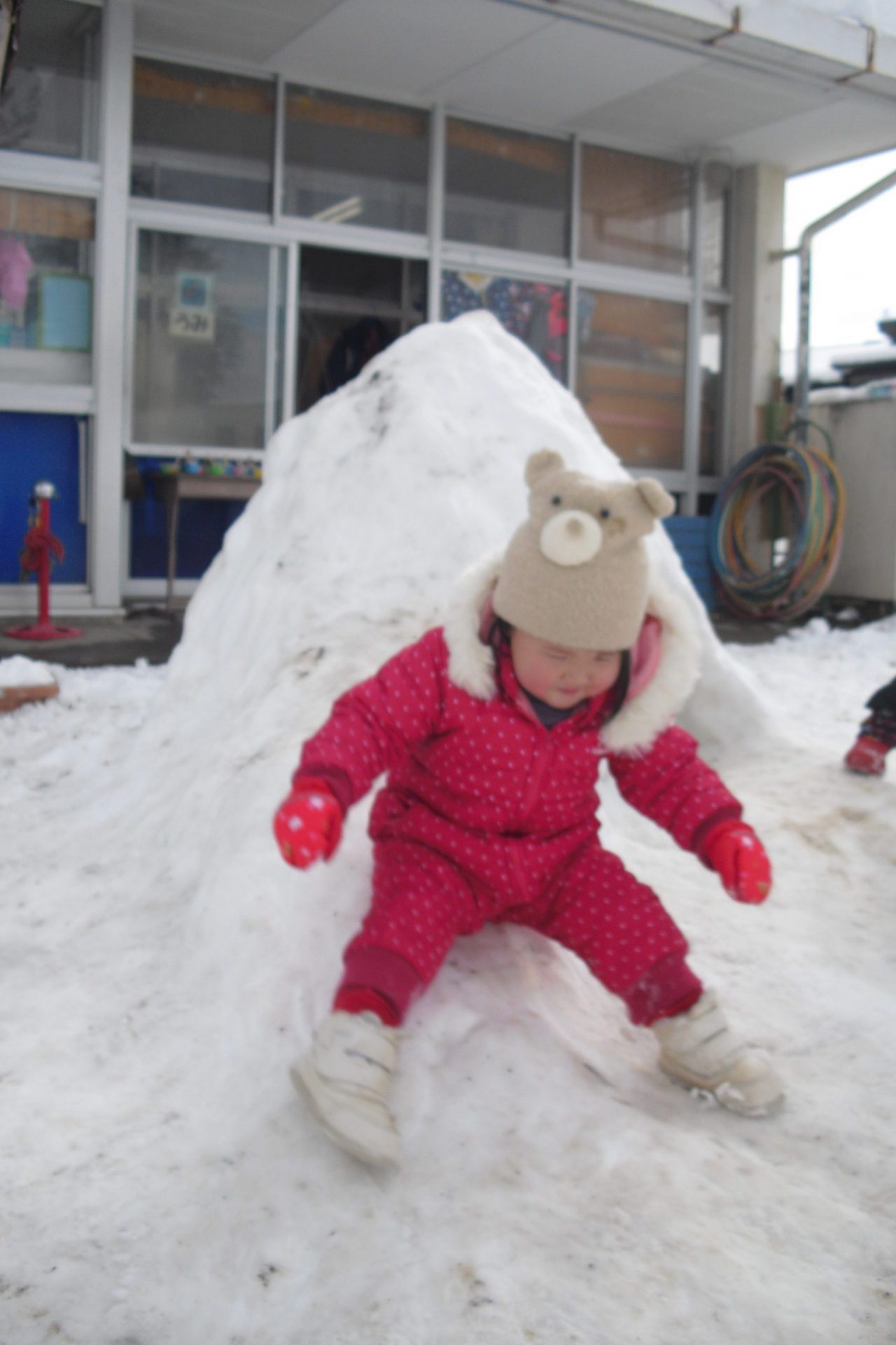 何度も滑っているとどんどん削れていってしまう雪山。新しい雪を運んできて『もっとかたく』『もっとたかく』とバンバン叩いていました。雪山が日に日に小さくなっていき、溶けきってしまうと「ない」と寂しそうにつぶやく子も、、。