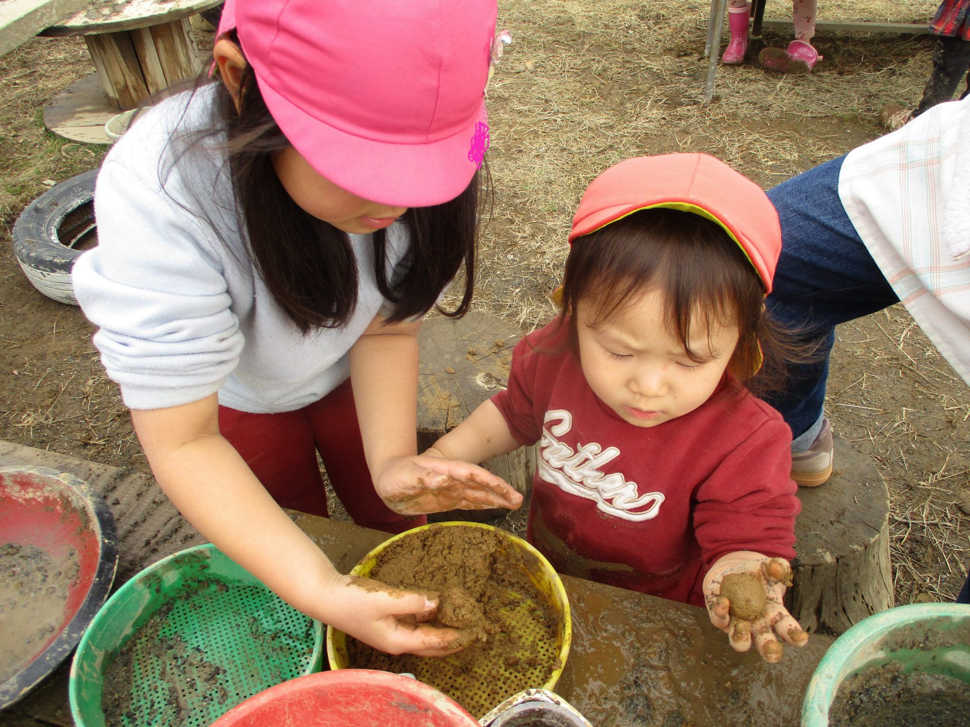 幼児さん達は赤土と水を混ぜてカレー作りやコーヒー作りなどを楽しんでいました。それを見ていた1歳児のA君。「先生、お団子作りたい」と言って保育士と一緒にお団子づくりを始めました。