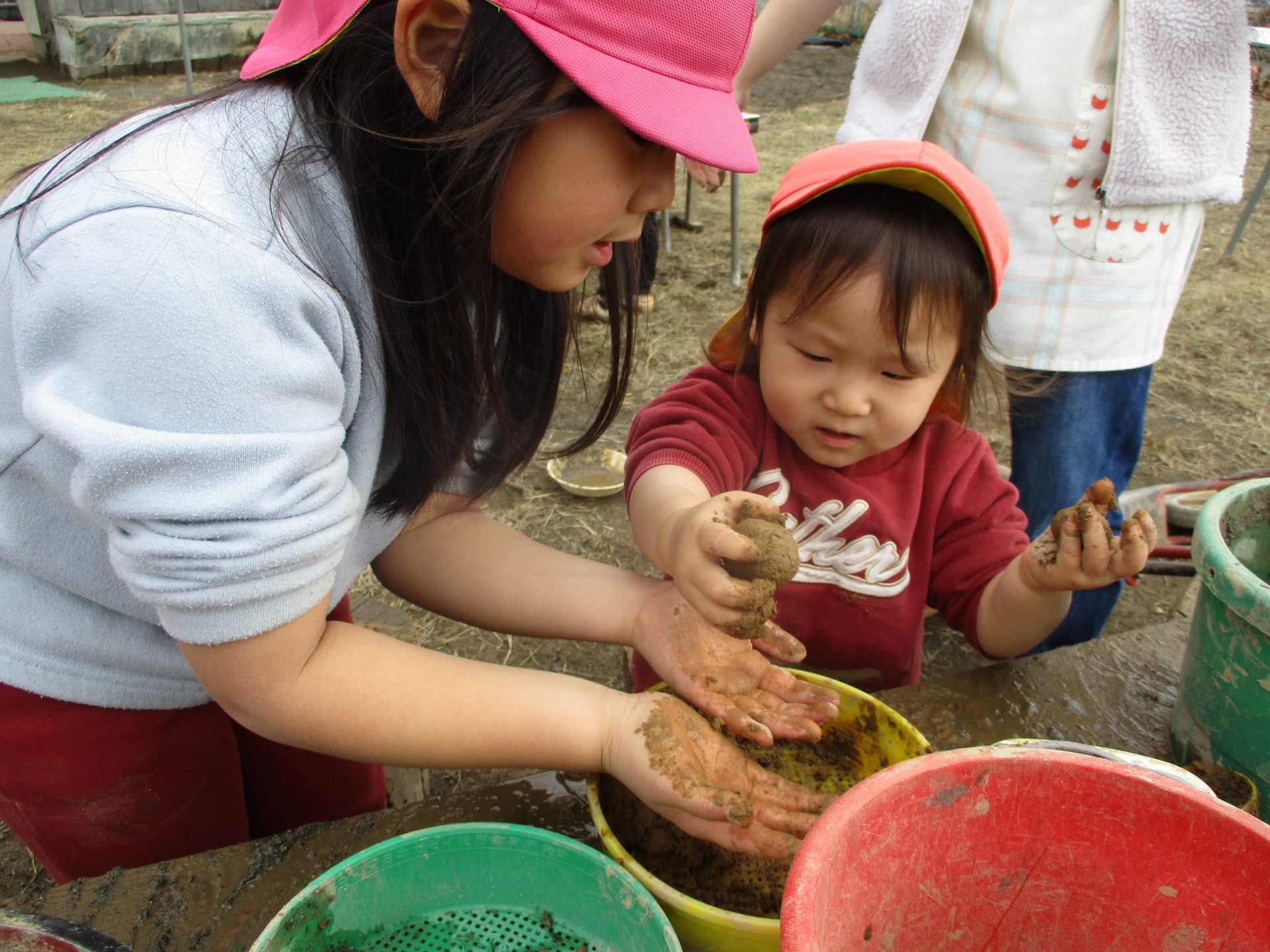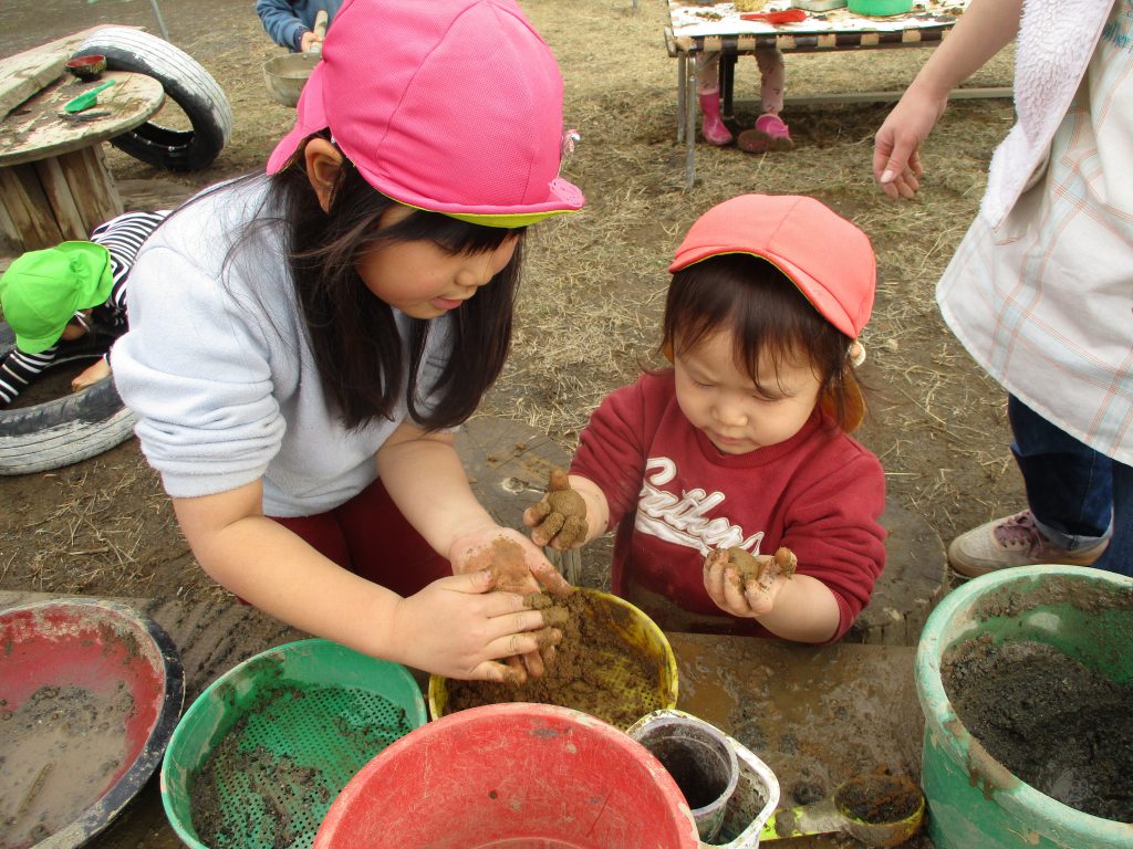 ・土や泥の様々な感触を楽しみ、自分なりに考えて試してみて、お友だちに教えてみたり、”気づき”を友だちにも共有する姿もみられた。