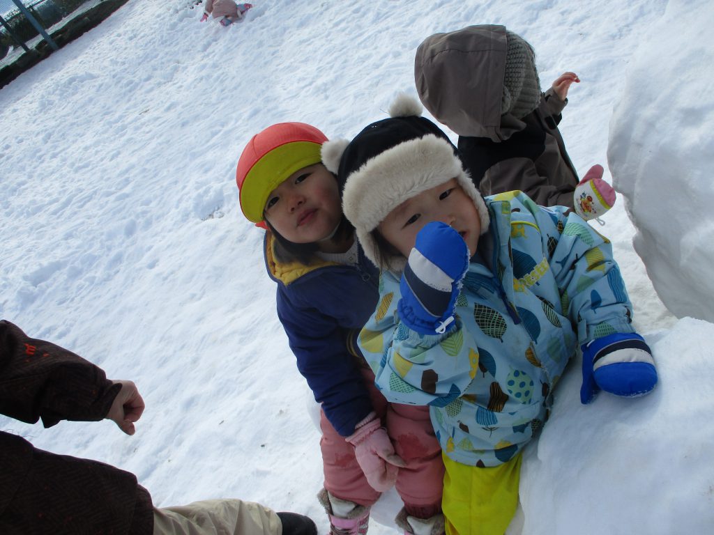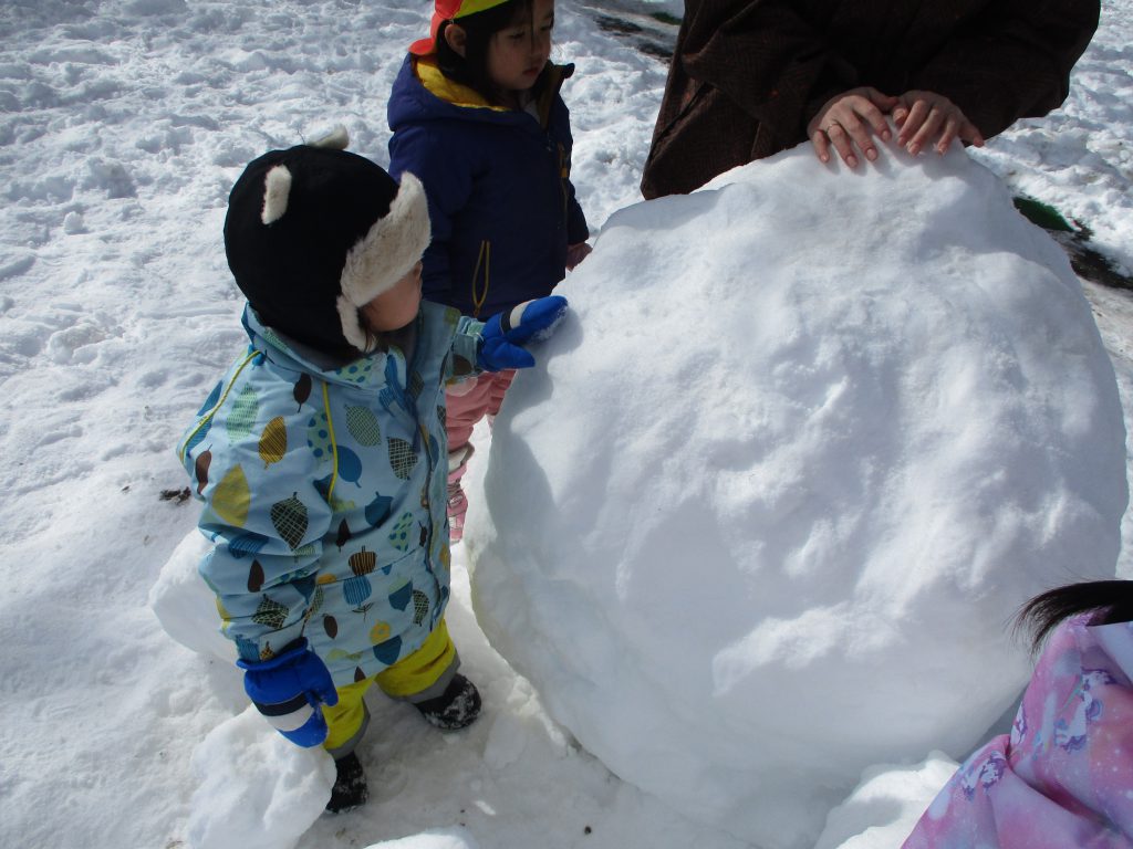 一方、それを隣で聞いていた2歳児のBちゃん「えっ!いいの?乗りた~い!」と乗り気で雪玉の上に乗り「たのしい~!たか~い!」と歓声をあげました。