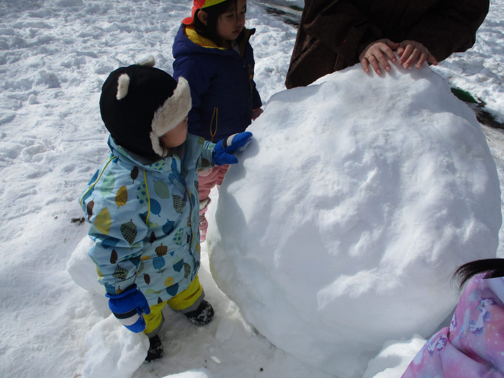 「やったー!」と満足気なA君。”雪玉に乗って楽しむ”ことから、また違う遊びが広がっていくのでした。