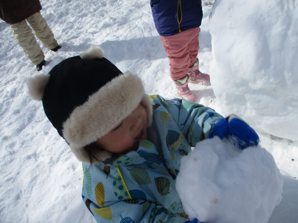 無事雪玉の上に乗れたA君、満面の笑みを浮かべ、乗っても壊れない頑丈な雪玉の感触や、雪玉の上の特等席からの景色を楽しみました。