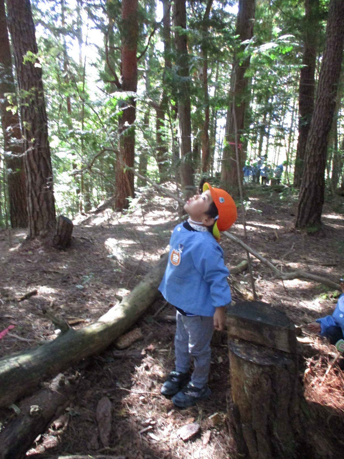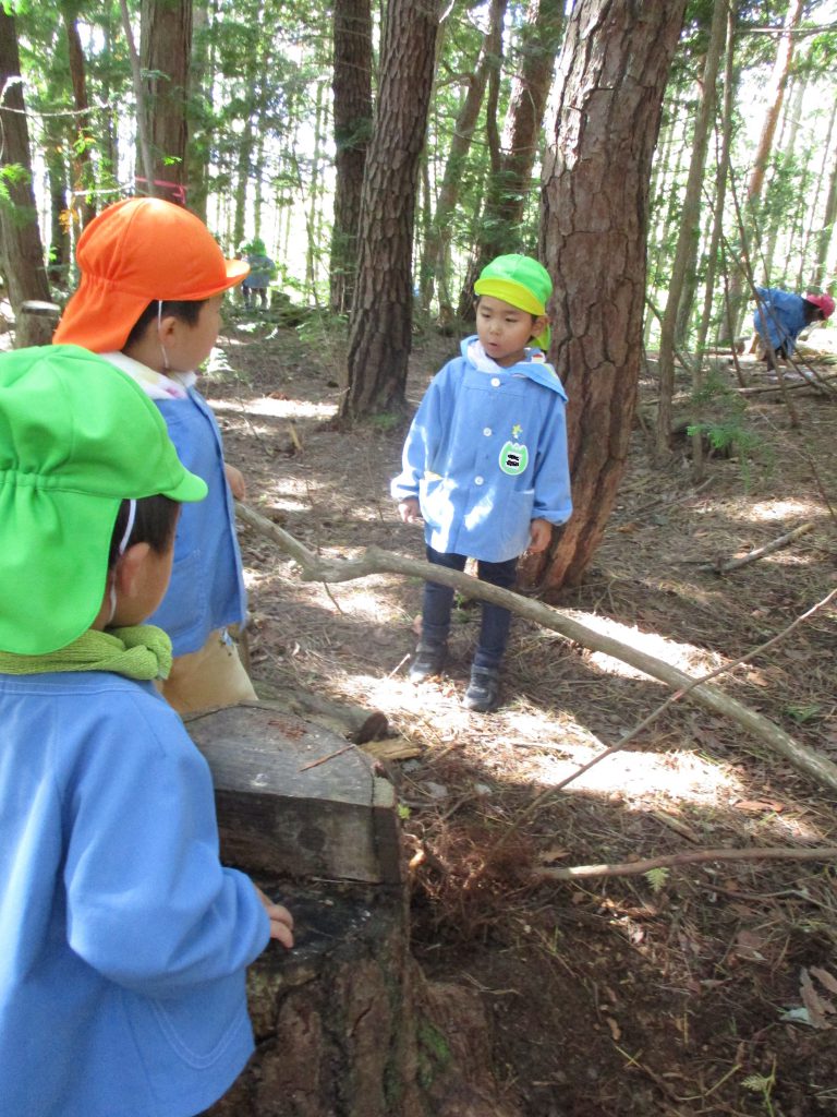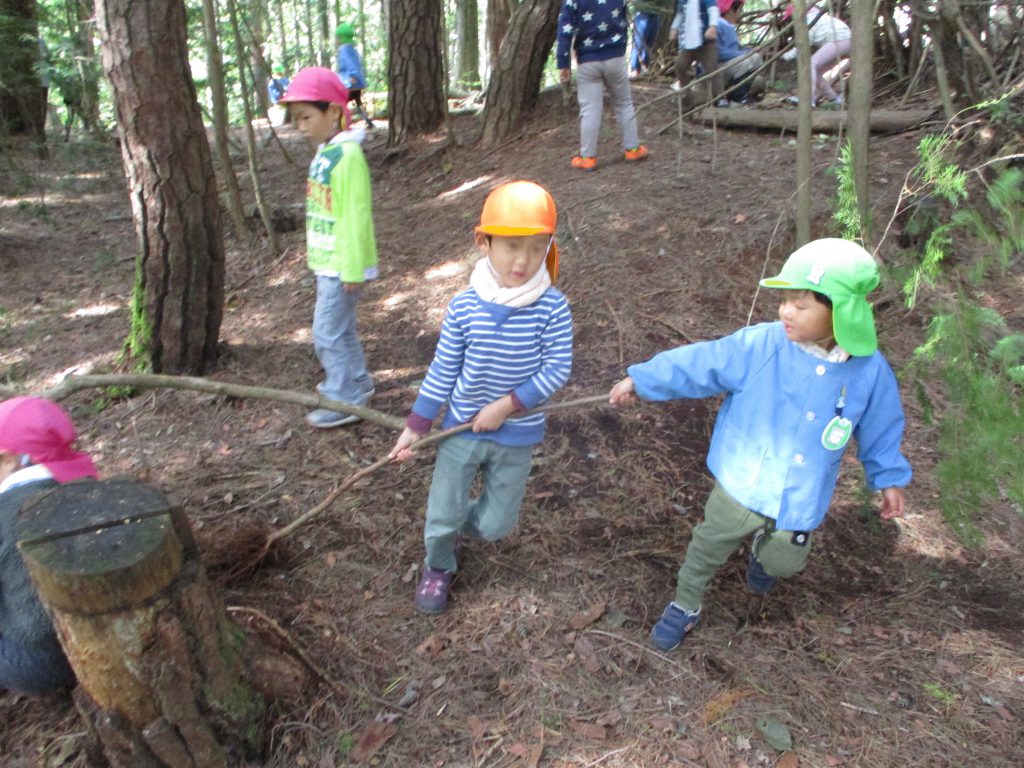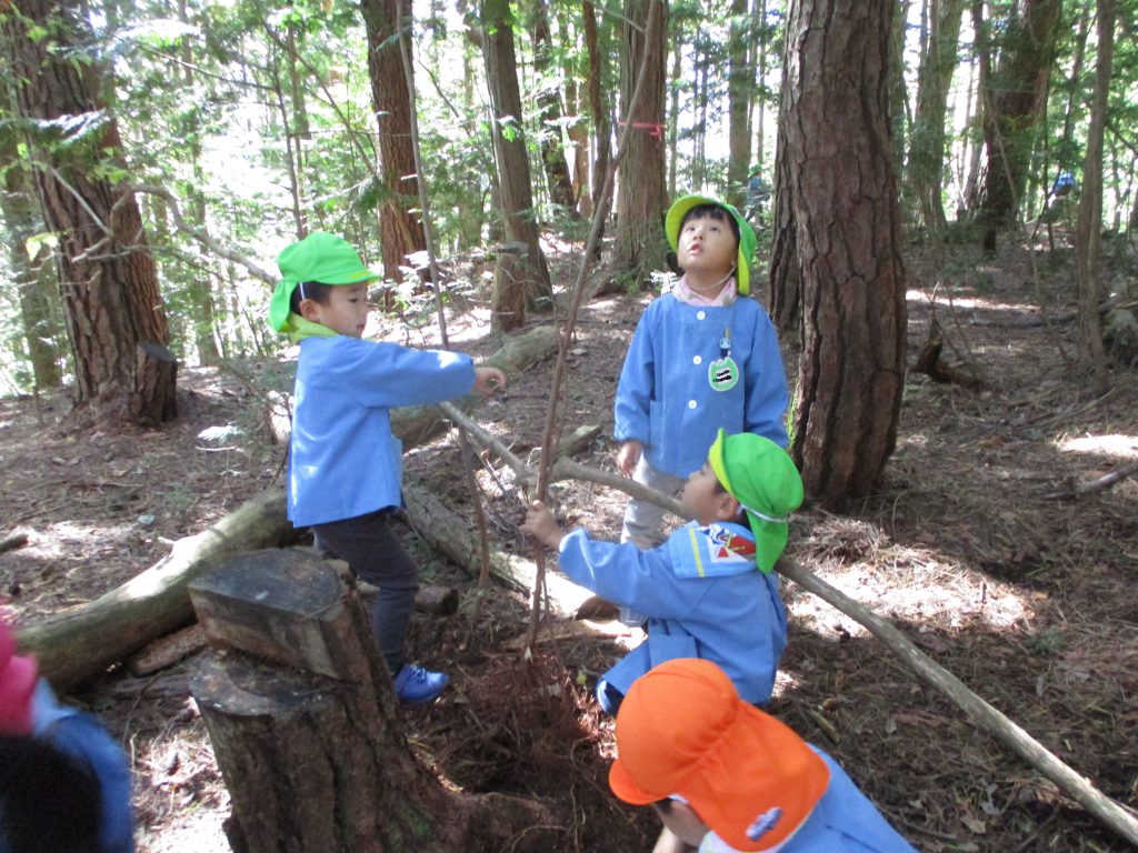 保育園の裏山の”山の広場”に出かけ、いつものように自然物を使いながら、自由に遊んでいた子ども達。