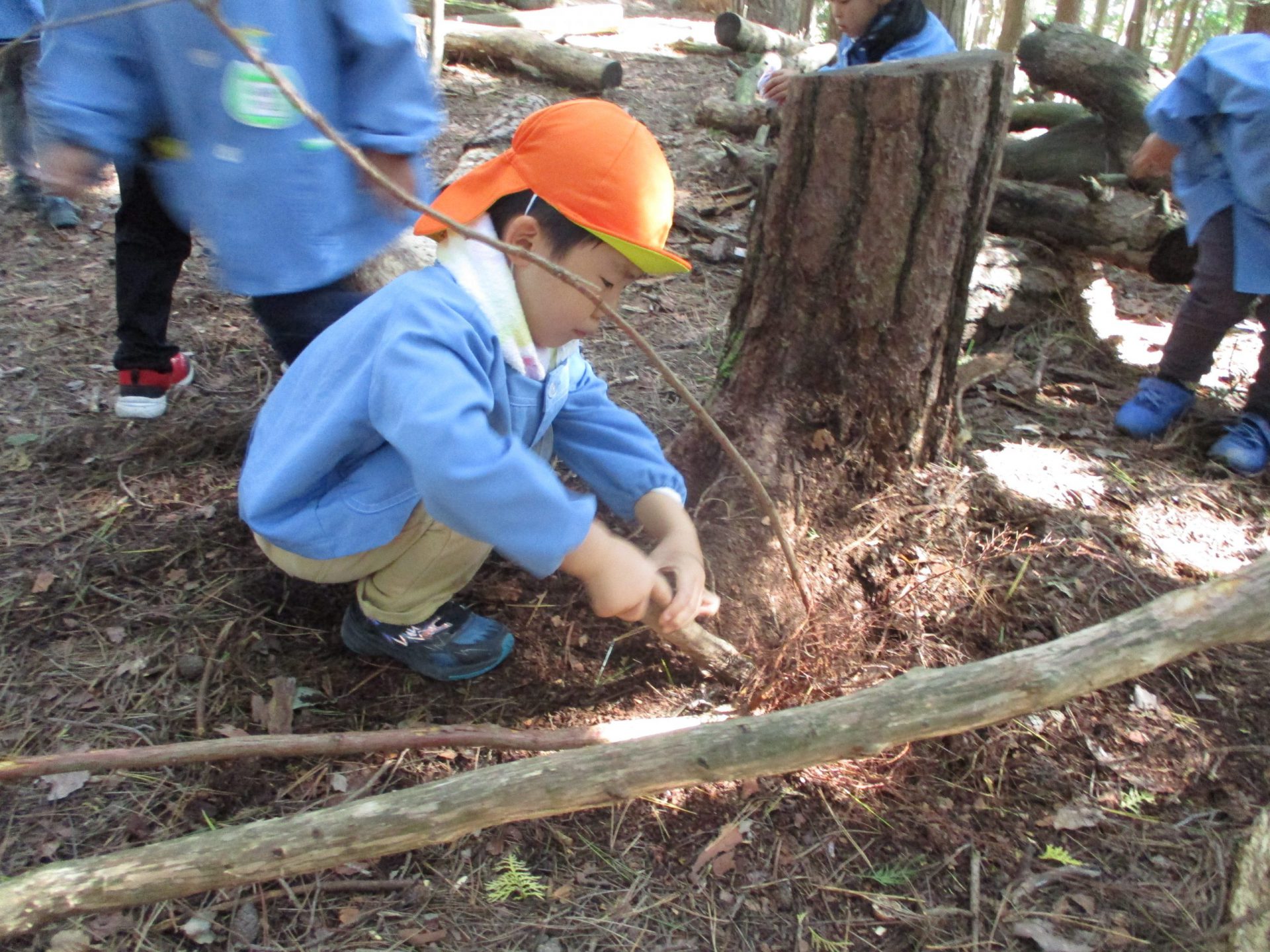 すると、それを見ていた4歳児のC君が「引っ張っても抜けないから掘ってみるね。」と、太い木の棒を使って木の根元を掘り始めました。順調に掘り進めるC君。