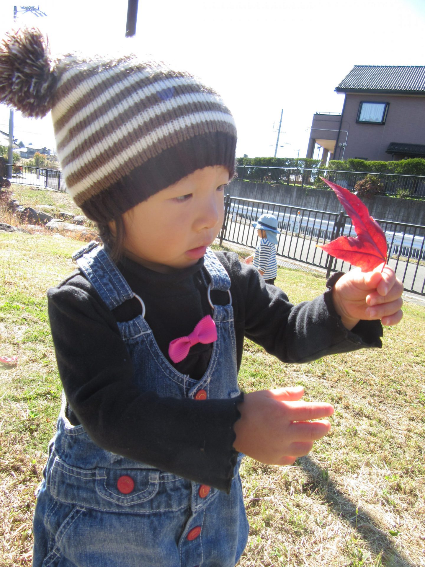 真っ赤な紅葉を”きれいだなぁ””面白い形だなぁ”と不思議そうにじーっと見つめている。