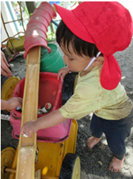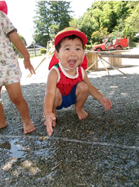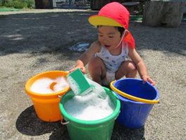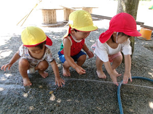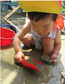 春からたくさん外で遊んできた子どもたち。砂場でスコップを使って砂を入れたり型にはめようとしたり、砂を手にかけてみたりと自分の好きな遊びを繰り返し楽しんできました。泥・水遊びも見る参加から始め、無理のないように参加できるところから始めました。