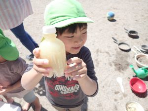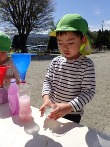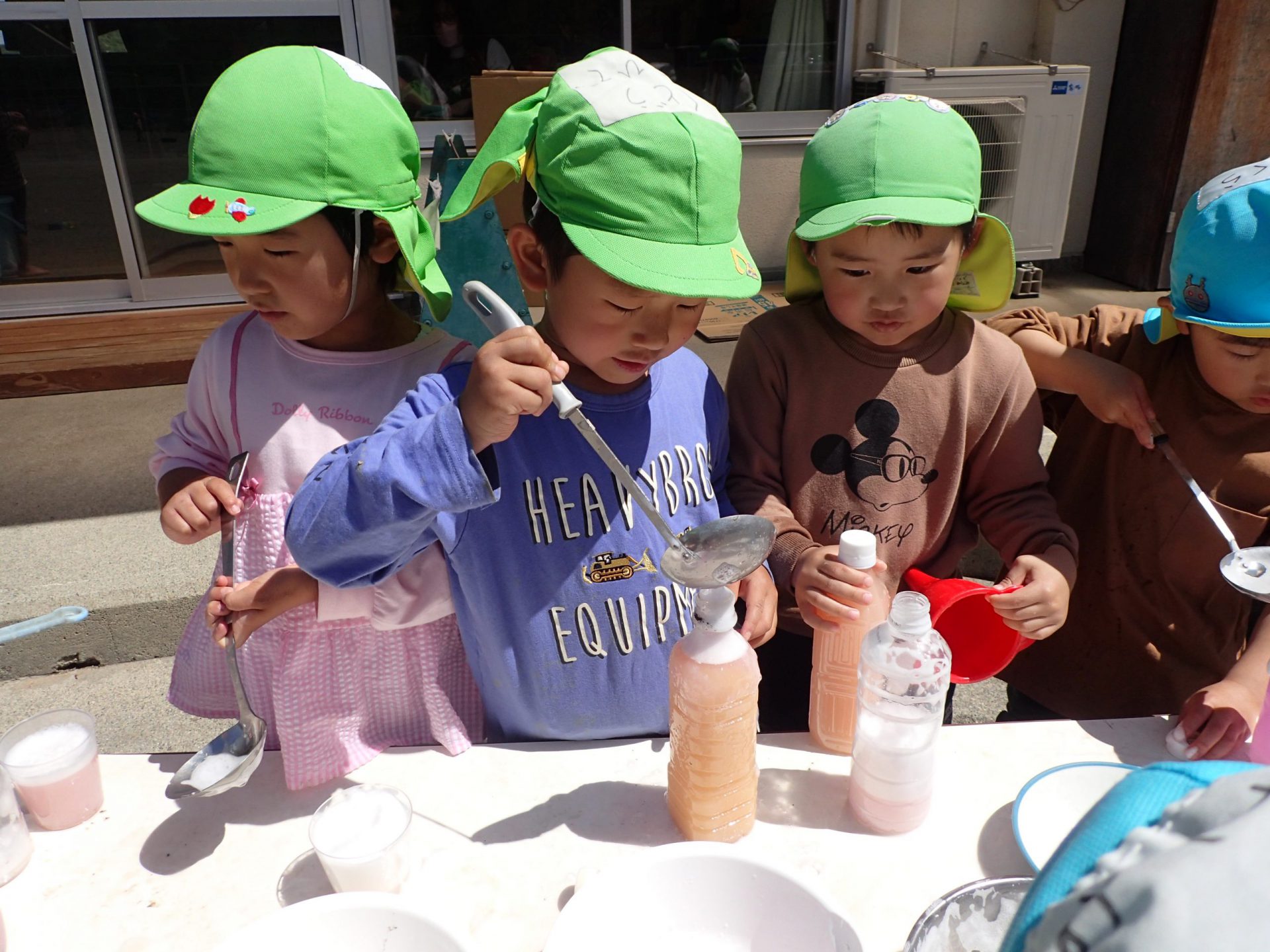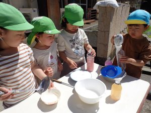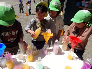 ・ジュースに見立ててごっこ遊びが始まり、友だちとのやりとりが一気に広がった。混色をしてきれいな水になったり混ぜすぎて茶色になってしまったり・・・。試してみる色の変化を楽しんでいた。「混ぜすぎると汚くなっちゃう」という気付きがあった。 いろいろな発見があり子ども達の発する言葉から感じ取れることが多くある。