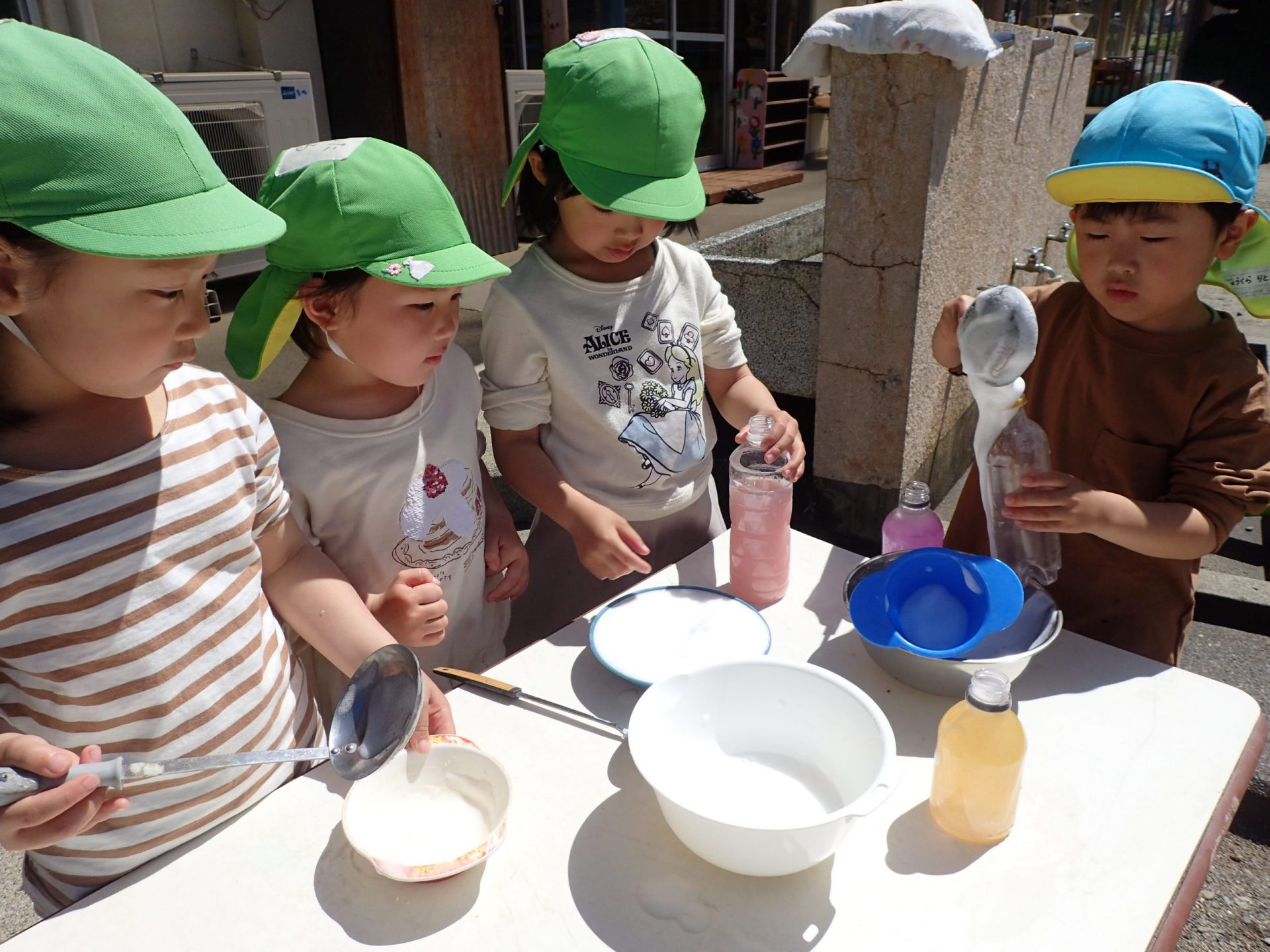 ・石鹸を泡立て泡遊びも並行していく。ジュースと泡を混ぜ、遊ぶ。泡の感触を十分に楽しむ。