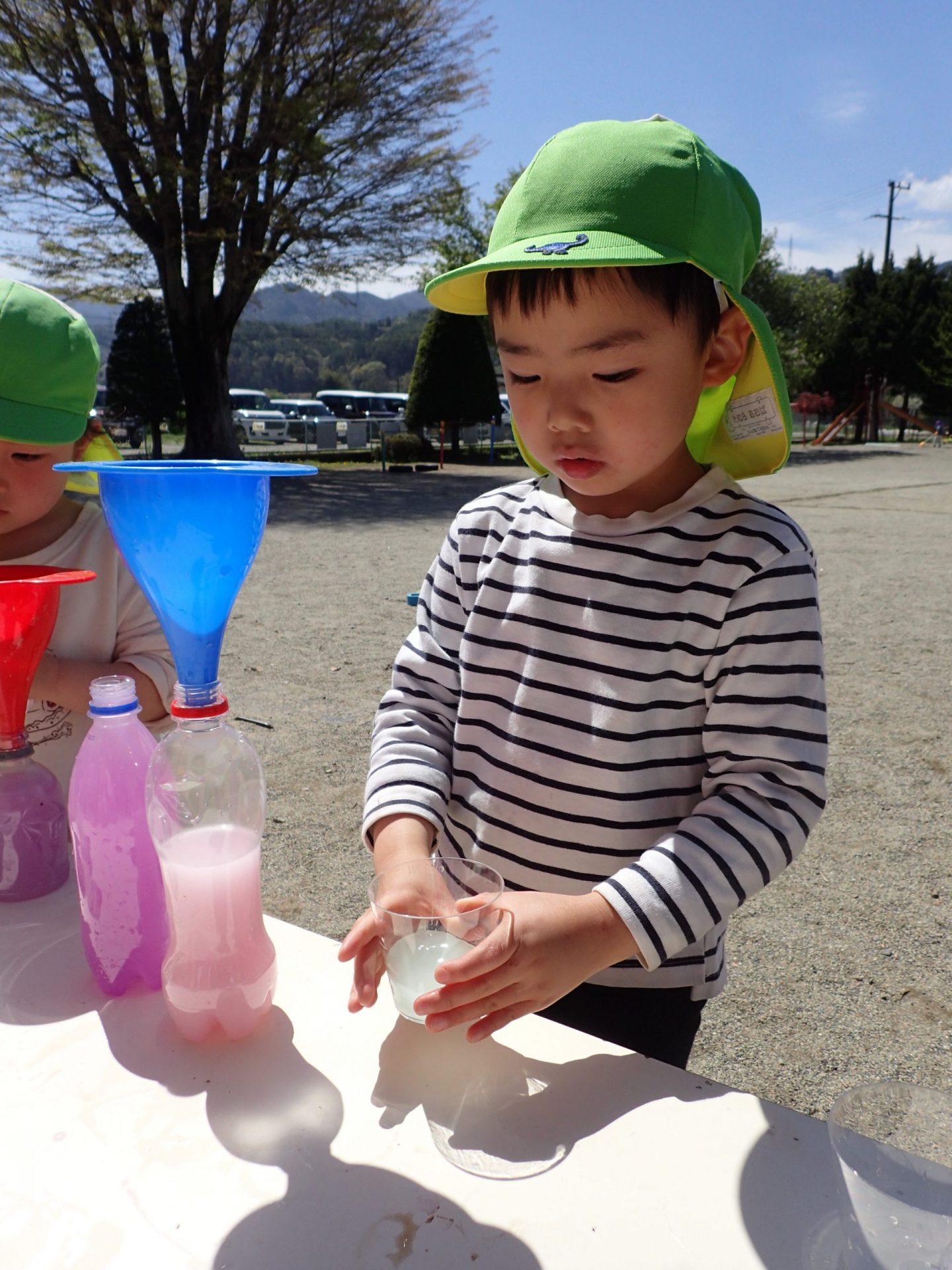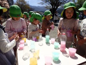 ・色水・プラコップ・ペットボトルを用意し混色を楽しんだりジュース屋さん等ごっこ遊びを楽しんだりする。