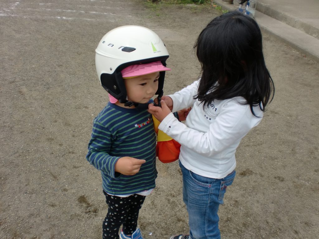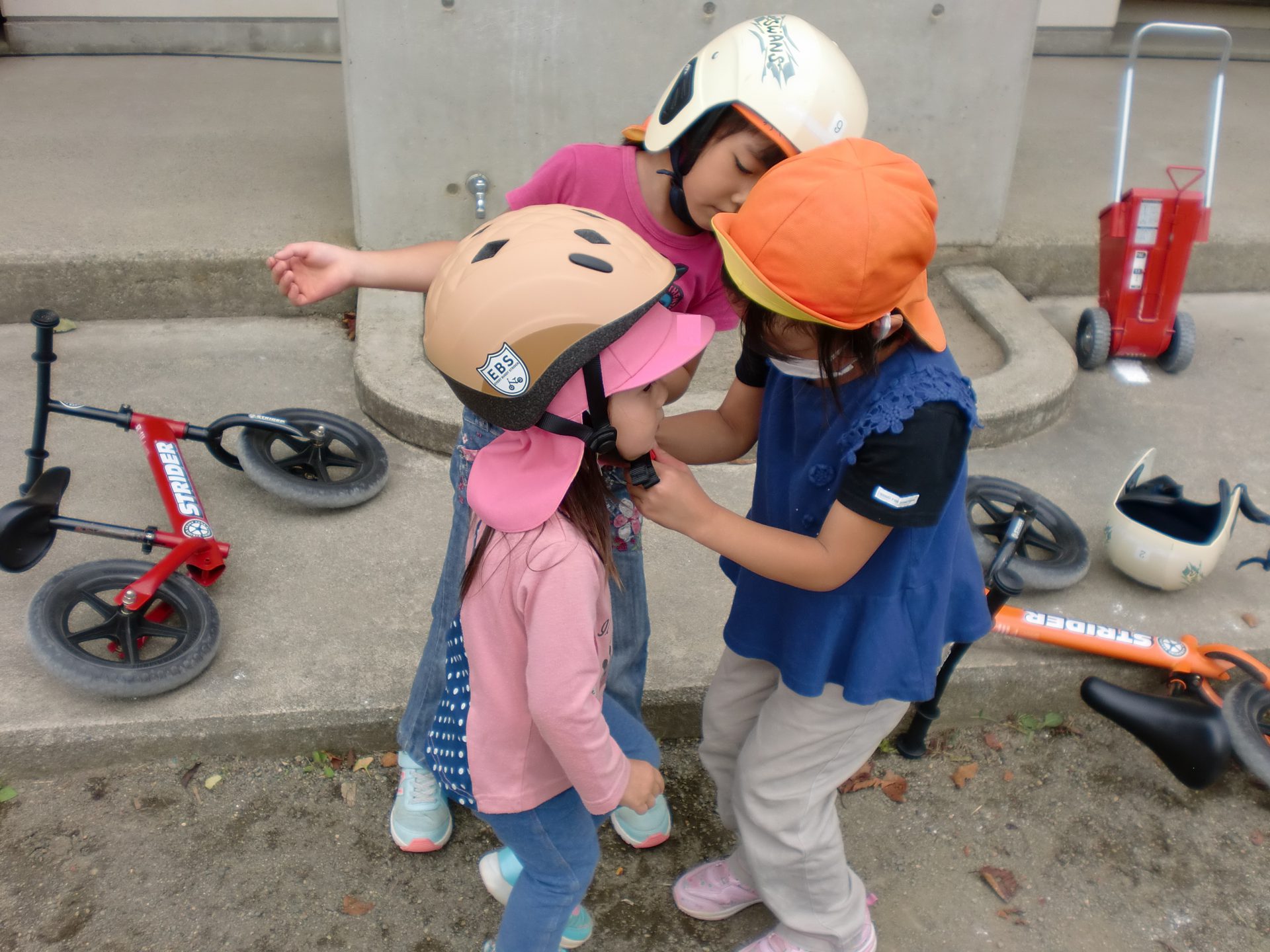 そんな姿に気付いた年上のお友達は、ヘルメットを被せてあげたり、ストライダーを用意してあげたりする姿が見られ、心が暖かくなる瞬間でした。