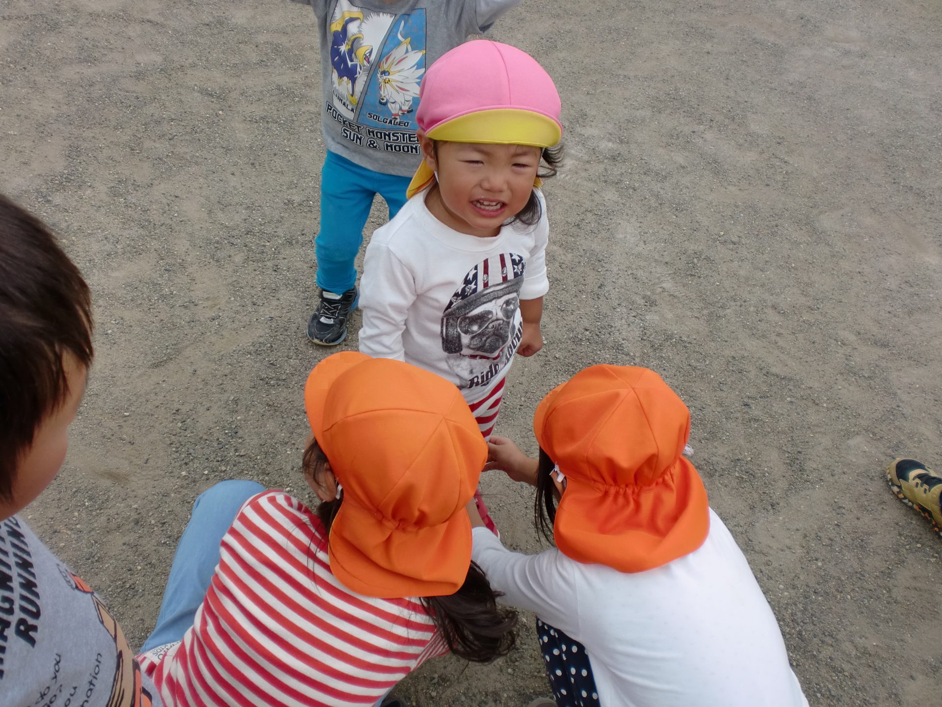 途中で、転んでしまったお友達がいると、「だいじょうぶ?」と声をかけながら、優しく砂を払ってあげている姿も見られました。