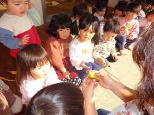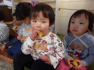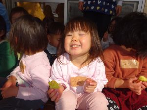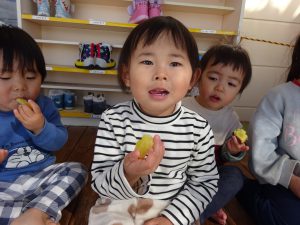 普段午前中のおやつにさつまいもが出ますが、この日のさつまいもに対する子どもたちの熱意は違いました。みんなで食べるとおいしいね。こんなに甘いんだね。いい匂いがするね。・・・今日のお芋は特別な味。年長さん作ってくれてありがとう。異年齢が一緒に生活する保育園の良さを感じる活動となりました。
